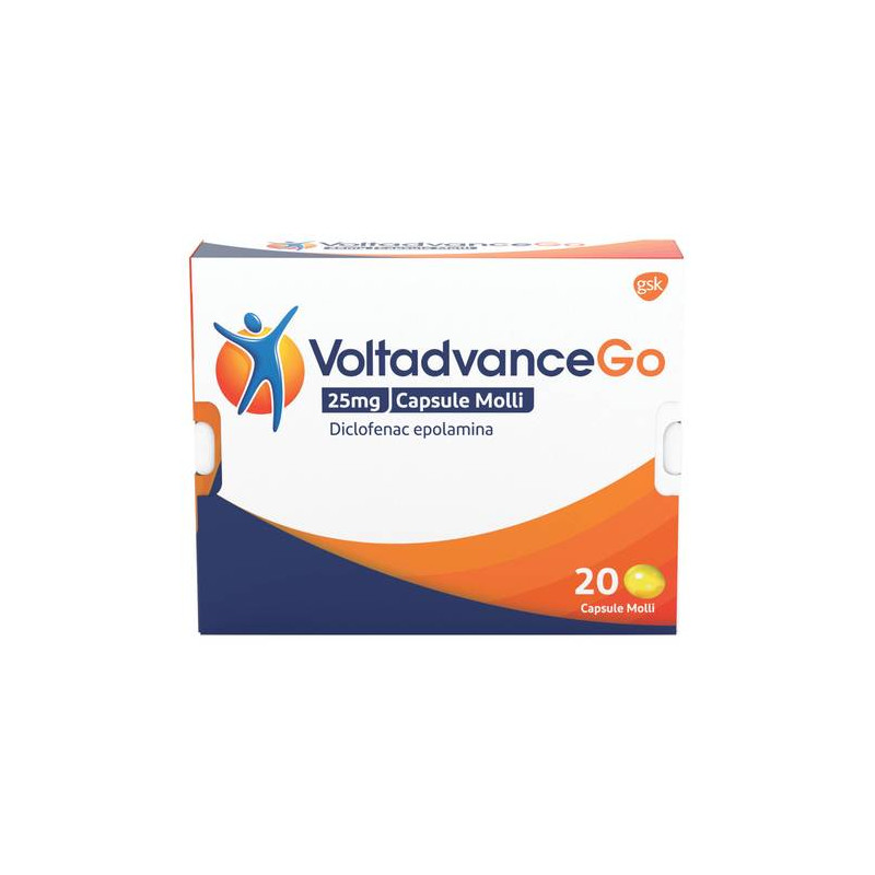 Posologia: gli effetti indesiderati possono essere ridotti al minimo somministrando la minima dose efficace per la minima durata necessariaper controllare i sintomi (vedere paragrafo 4.4 Avvertenze speciali eprecauzioni di impiego). Per VoltadvanceGo 12,5 mg: se non diversamente prescritto, adulti e adolescenti di eta' superiore ai 14 anni devonoiniziare con 1 o 2 capsule molli e continuare successivamente con 1 o2 capsule molli ogni 4 - 6 ore, al bisogno. In ogni caso, non si devono assumere piu' di 6 capsule molli (equivalenti a 75 mg di diclofenacpotassico) nell'arco di 24 ore. Per VoltadvanceGo 25 mg: se non diversamente prescritto, adulti e adolescenti di eta' superiore ai 14 annidevono iniziare con 1 capsula molle e continuare successivamente con 1capsula molle ogni 4 - 6 ore, al bisogno. In ogni caso, non si devonoassumere piu' di 3 capsule molli (equivalenti a 75 mg di diclofenac potassico) nell'arco di 24 ore. VoltadvanceGo deve essere assunto per un breve periodo di tempo. La durata del trattamento deve essere di 3 giorni. Se i sintomi persistono o peggiorano, consultare un medico. Popolazione pediatrica: l'uso di VoltadvanceGo non e' raccomandato nei bambini e negli adolescenti al di sotto dei 14 anni di eta'. Anziani: non e' necessario nessun aggiustamento particolare del dosaggio. In considerazione del profilo di effetti indesiderati possibili, gli anzianidevono essere monitorati con particolare attenzione (vedere paragrafo4.4). Danno renale: Diclofenac e' controindicato nei pazienti con danno renale grave (vedere paragrafo 4.3). Non e' necessaria nessuna riduzione della dose nei pazienti con funzionalita' renale ridotta da lievea moderata. Si consiglia cautela quando si somministra diclofenac aipazienti con danno renale da lieve a moderato (vedere paragrafo 4.4).Compromissione epatica: Diclofenac e' controindicato nei pazienti concompromissione epatica grave (vedere paragrafo 4.3). Non e' necessarianessuna riduzione della dose nei pazienti con funzionalita' epatica da lieve a moderata. Si consiglia cautela quando si somministra diclofenac ai pazienti con compromissione epatica da lieve a moderata (vedereparagrafo 4.4). Modo di somministrazione: le capsule molli devono essere deglutite intere con un sorso d'acqua. La velocita' di assorbimento di diclofenac e' ridotta quando VoltadvanceGo e' assunto con il cibo. Si raccomanda pertanto di non assumere le capsule molli durante o immediatamente dopo i pasti.