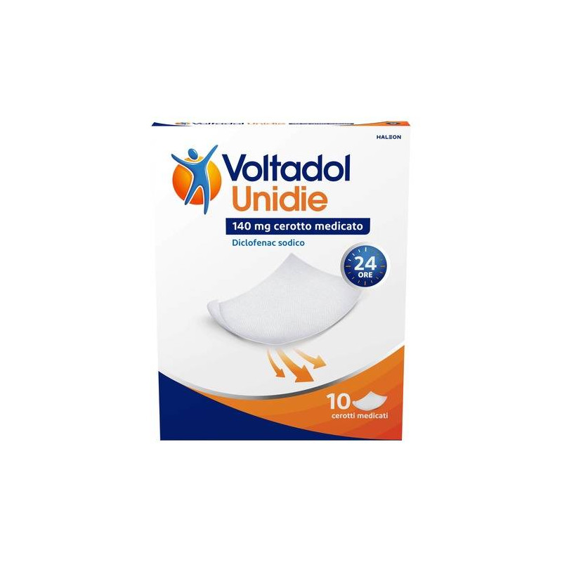 AVVERTENZE Il cerotto medicato non deve entrare in contatto o essere applicato suocchi o mucose. Gli effetti indesiderati possono essere ridotti utilizzando la piu' bassa dose efficace per il piu' breve tempo possibile (vedere paragrafo 4.2). Nei pazienti che soffrono o hanno sofferto in passato di asma bronchiale o allergie puo' verificarsi broncospasmo. Sedopo l'applicazione del cerotto medicato si sviluppa una eruzione cutanea, il trattamento deve essere interrotto immediatamente. Dopo la rimozione del cerotto medicato, i pazienti devono essere informati dellanecessita' di evitare l'esposizione alla luce del sole o alle lampadesolari, al fine di ridurre il rischio di fotosensibilizzazione. Non e' possibile escludere la possibilita' di eventi avversi sistemici derivanti dall'applicazione di diclofenac cerotto medicato, se il prodottoviene utilizzato su superfici cutanee estese per un periodo di tempoprolungato. Sebbene gli effetti sistemici possano essere di entita' minima, il cerotto medicato deve essere usato con cautela nei pazienti con compromissione della funzione renale, cardiaca o epatica, o con anamnesi di ulcera peptica, infiammazione intestinale o diatesi emorragica. I farmaci antinfiammatori non steroidei devono essere usati con cautela nei pazienti anziani, poiche' tali soggetti sono piu' esposti all'insorgenza di effetti indesiderati. Non somministrare simultaneamente, per via topica o sistemica, qualsiasi altro medicinale contenente diclofenac o altri farmaci antinfiammatori non steroidei (FANS). Il butilidrossianisolo (E 320) puo' causare reazioni sulla pelle localizzate(ad es. dermatite da contatto) o irritazione agli occhi e alle mucose. CATEGORIA FARMACOTERAPEUTICA Farmaci per uso topico per dolori articolari e muscolari; farmaci antiinfiammatori non steroidei per uso topico. CONSERVAZIONE Conservare nella confezione originale per proteggere il medicinale dalla luce e dall'umidita'. CONTROINDICAZIONI/EFF.SECONDAR Ipersensibilita' al principio attivo o ad uno qualsiasi degli eccipienti elencati al paragrafo 6.1, ipersensibilita' all'acido acetilsalicilico o ad altri farmaci antinfiammatori non steroidei [FANS], pazientiche hanno avuto in passato attacchi di asma, orticaria o rinite acutadopo l'uso di acido acetilsalicilico o di altri farmaci anti-infiammatori non steroidei (FANS). Pazienti con ulcera peptica attiva; cute danneggiata, indipendentemente dal tipo di lesione: dermatite essudativa,eczema, lesione infetta, ustioni o ferite, terzo trimestre di gravidanza, bambini e adolescenti di eta' inferiore a 16 anni. DENOMINAZIONE VOLTADOL UNIDIE 140 MG CEROTTO MEDICATO ECCIPIENTI Strato di supporto: poliestere di tessuto-non-tessuto. Strato adesivo:poliacrilato dispersione, tributil citrato, butilidrossianisolo (E 320). Strato protettivo: carta mono siliconata. EFFETTI INDESIDERATI Gli effetti indesiderati sono riportati sulla base delle seguenti categorie di frequenza: molto comune >=1/10; comune da >= 1/100 a <1/10; non comune da >=1/1.000 a <1/100; raro da >=1/10.000 a <1/1.000; moltoraro <1/10.000; non nota: la frequenza non puo' essere definita sullabase dei dati disponibili. Infezioni e manifestazioni. Molto raro: esantema pustoloso. Disturbi del sistema immunitario. Molto raro: ipersensibilita' (inclusa orticaria), edema angioneurotico, reazione anafilattoide. Patologie respiratorie, toraciche e mediastiniche. Molto raro:asma. Patologie della cute e del tessuto sottocutaneo. Comune: rash, eczema, eritema, dermatite (inclusa dermatite allergica e dermatite dacontatto), prurito; raro: dermatite bollosa (ad es. Eritema bolloso),secchezza della cute; molto raro: reazioni di fotosensibilita'. Patologie sistemiche e condizioni relative alla sede di somministrazione. Comune: reazioni nella sede di somministrazione. I livelli di diclofenacmisurati nel plasma sistemico secondo le modalita' d'uso dei cerottimedicati indicate in etichetta, sono molto bassi se paragonati con quelli rilevati dopo assunzione orale di diclofenac. Il rischio di sviluppare effetti indesiderati sistemici (come disturbi gastrici, epatici erenali, reazioni di ipersensibilita' sistemica), quindi, appare bassocon l'uso del cerotto. Tuttavia, qualora il diclofenac venga usato suampie superfici cutanee e per lunghi periodi di tempo, e' possibile la comparsa di effetti indesiderati sistemici. Segnalazione delle reazioni avverse sospette. La segnalazione delle reazioni avverse sospetteche si verificano dopo l'autorizzazione del medicinale e' importante,in quanto permette un monitoraggio continuo del rapporto beneficio/rischio del medicinale. Agli operatori sanitari e' richiesto di segnalarequalsiasi reazione avversa sospetta tramite il sistema nazionale di segnalazione. GRAVIDANZA E ALLATTAMENTO Gravidanza: la concentrazione sistemica di diclofenac in seguito a somministrazione topica risulta inferiore a quella correlata alle formulazioni orali. Facendo riferimento all'esperienza derivante dal trattamento con i FANS sistemici, si raccomanda quanto segue: l'inibizione della sintesi delle prostaglandine puo' comportare effetti negativi durante la gravidanza e/o durante lo sviluppo embrionale/fetale. I dati derivanti dagli studi epidemiologici suggeriscono un aumentato rischio diaborto spontaneo, malformazioni cardiache e gastroschisi, in seguitoall'uso di inibitori della sintesi delle prostaglandine nei primi mesidella gravidanza. Il rischio assoluto di malformazioni cardiovascolari e' risultato aumentato da un valore inferiore all'1% fino ad un massimo di circa l'1,5%. Si ritiene che il rischio aumenti al crescere della dose e della durata del trattamento. Negli animali, la somministrazione di inibitori della sintesi di prostaglandine ha mostrato di provocare un aumento della perdita pre e post-impianto e di mortalita' embrio-fetale. Inoltre, un aumento d'incidenza di varie malformazioni, inclusa quella cardiovascolare, e' stato riportato in animali cui erano stati somministrati inibitori della sintesi del