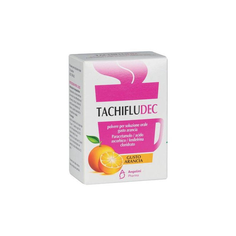 AVVERTENZE I pazienti devono essere avvisati di non prendere altri medicinali contenenti paracetamolo mentre assumono Tachifludec in quanto dosi elevate di paracetamolo possono causare reazioni avverse gravi. Evitare il consumo di alcool durante il trattamento con Tachifludec. Il pericolo di sovradosaggio e' infatti maggiore nei pazienti con problemi epaticiInvitare il paziente a contattare il medico prima di associare warfarin o qualsiasi altro farmaco (vedere anche il paragrafo 4.5). E' sconsigliato l'uso del prodotto se il paziente e' in trattamento con antiinfiammatori. Si consiglia cautela se il paracetamolo viene somministratoin concomitanza con flucloxacillina a causa dell'aumentato rischio diacidosi metabolica con gap anionico elevato (HAGMA), in particolare nei pazienti con grave compromissione renale, sepsi, malnutrizione e altre fonti di carenza di glutatione (ad es. alcolismo cronico), cosi' come in quelli che utilizzano le dosi massime giornaliere di paracetamolo. Si raccomanda un attento monitoraggio, inclusa la misurazione della 5-oxoprolina urinaria. Consultare il medico prima di usare il prodotto in pazienti con ingrossamento della ghiandola prostatica o malattievascolari occlusive (ad es. sindrome di Raynaud). Non superare la dose consigliata e non somministrare per oltre 3 giorni consecutivi. Tachifludec gusto arancia contiene, sodio: questo medicinale contiene 135,82 mg di sodio per bustina, equivalente al 6,79% dell'assunzione massima giornaliera raccomandata dall'OMS che corrisponde a 2 g di sodio per un adulto, da tenere in considerazione in pazienti con ridotta funzionalita' renale o che seguano una dieta a basso contenuto di sodio. Saccarosio: i pazienti affetti da rari problemi ereditari di intolleranza al fruttosio, da malassorbimento di glucosio-galattosio o da insufficienza di sucrasi isomaltasi non devono assumere questo medicinale. Ipazienti con diabete devono prendere in considerazione il contenuto disaccarosio all'interno del Tachifludec quando assumono piu' di 2 bustine al giorno (saccarosio> 5g). Glucosio: i pazienti affetti da rari problemi di malassorbimento di glucosio-galattosio non devono assumerequesto medicinale. CATEGORIA FARMACOTERAPEUTICA Altri analgesici/paracetamolo, associazioni. CONSERVAZIONE Conservare a temperatura inferiore a 25 gradi C. Conservare nel contenitore originario per proteggere il medicinale dall'umidita' e dalla luce. CONTROINDICAZIONI/EFF.SECONDAR Bambini di eta' inferiore ai 12 anni; ipersensibilita' ai principi attivi o ad uno qualsiasi degli eccipienti (elencati al paragrafo 6.1); pazienti che assumono beta-bloccanti; pazienti che assumono antidepressivi triciclici e quelli che assumono o hanno assunto nelle ultime 2 settimane inibitori delle monoamminoossidasi; pazienti con asma bronchiale, feocromocitoma, glaucoma ad angolo chiuso, o che assumono contemporaneamente altri medicinali simpatico mimetici (come decongestionanti,soppressori dell'appetito e psicostimolanti simili alle amfetamine);pazienti affetti da insufficienza epatica o renale, diabete, ipertiroidismo, ipertensione e malattie cardiovascolari. I prodotti a base di paracetamolo sono controindicati nei pazienti con manifesta insufficienza del glucosio-6-fosfato deidrogenasi ed in quelli affetti da grave anemia emolitica; grave insufficienza epatocellulare. DENOMINAZIONE TACHIFLUDEC POLVERE PER SOLUZIONE ORALE GUSTO ARANCIA ECCIPIENTI Saccarosio, acido citrico anidro, sodio citrato, amido di mais, sodiociclamato, saccarina sodica, silice colloidale anidra, aroma arancia rossa, curcumina (E100), sciroppo di glucosio essiccato. EFFETTI INDESIDERATI Di seguito sono riportati gli effetti indesiderati organizzati secondola classificazione per Sistemi ed Organi MedDRA. La frequenza e' cosi' definita: molto comune (>=1/10), comune (da >=1/100 a <1/10), non comune (da >=1/1000 a <1/100), raro (da >=1/10.000 a <1/1000), molto raro (<1/10.000), non nota (la frequenza non puo' essere definita sulla base dei dati disponibili). Patologie del sistema emolinfopoietico. Rara: agranulocitosi1, leucopenia1, trombocitopenia1; non nota: anemia1.Disturbi del sistema immunitario. Rara: reazioni allergiche1,2, reazioni da ipersensibilita'1,2, anafilassi1,2; non nota: shock anafilattico1, 2. Disturbi del metabolismo e della nutrizione. Comune: anoressia2.Disturbi psichiatrici molto rara: insonnia2, nervosismo2, ansia2, irrequietezza2, confusione2, irritabilita'2. Patologie del sistema nervoso. Molto rara: tremore2, capogiro2, cefalea2. Patologie dell'occhio. Non nota: midriasi2, glaucoma acuto ad angolo chiuso2. Patologie cardiache. Rara: tachicardia2, palpitazioni2. Patologie vascolari. Non nota:ipertensione2. Patologie respiratorie, toraciche e mediastiniche. Rara: broncospasmo1,2; non nota: edema della laringe1. Patologie gastrointestinali. Comune: nausea2, vomito2; non nota: diarrea1, patologia gastrointestinale1. Patologie epatobiliari. Rara: funzione epatica anormale1; non nota: patologia epatica1, epatite1. Patologie della cute e del tessuto sottocutaneo. Rara: eruzione cutanea1,2, angioedema2; non nota: necrolisi tossica epidermica1, sindrome di steven johnson1, eritema multiforme o polimorfo1. Disturbi renali e urinari. Molto rara: nefrite tubulointerstiziale (dopo uso prolungato del paracetamolo a dosi elevate)1; non nota: insufficienza renale aggravata1, ematuria1, anuria1 ritenzione di urina2. Sono stati segnalati casi molto rari di reazioni cutanee gravi. ^1 Effetti indesiderati associati al paracetamolo ^2Effetti indesiderati associati alla fenilefrina. Segnalazione delle reazioni avverse sospette. La segnalazione delle reazioni avverse sospette che si verificano dopo l'autorizzazione del medicinale e' importante, in quanto permette un monitoraggio continuo del rapporto beneficio/rischio del medicinale. Agli operatori sanitari e' richiesto di segnalare qualsiasi reazione avversa sospetta tramite il sistema nazionaledi segnalazione al sito https://www.aifa.gov.it/conten