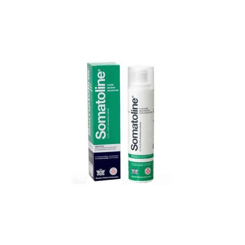 AVVERTENZE L'uso, specie se ripetuto o protratto di prodotti per uso topico puo' dare origine a fenomeni di sensibilizzazione. Ove cio' si verifichi interrompere il trattamento e valutare la necessita' di istituire un'idonea terapia. Non utilizzare in vicinanza delle mucose. Contiene para-idrossibenzoati che possono provocare reazioni allergiche (anche ritardate). CATEGORIA FARMACOTERAPEUTICA Preparati dermatologici. CONSERVAZIONE Questo medicinale non richiede alcuna condizione particolare di conservazione. CONTROINDICAZIONI/EFF.SECONDAR Ipersensibilita' ai principi attivi o ad uno qualsiasi degli eccipienti. Intolleranza allo iodio. Generalmente controindicato in gravidanza e durante l'allattamento. DENOMINAZIONE SOMATOLINE 0,1% + 0,3% EMULSIONE CUTANEA ECCIPIENTI Glicerilmonostearato A.E., gomma xantana, paraffina liquida, deciloleato, sorbitolo 70% non cristallizzabile, poliacrilamide isoparaffin laureth-7, imidazolidinilurea, metile para-idrossibenzoato, propile para-idrossibenzoato, acido citrico monoidrato, profumo rose, acqua depurata. EFFETTI INDESIDERATI Molto raramente sono stati segnalati casi con sintomi riconducibili ad alterata funzionalita' tiroidea. Segnalare qualsiasi reazione avversa sospetta. GRAVIDANZA E ALLATTAMENTO Non si conoscono dati sperimentali o clinici che depongano contro l'uso del prodotto in gravidanza. Comunque la prudenza sconsiglia di applicare il prodotto durante la gravidanza o durante l'allattamento. INDICAZIONI Stati di adiposita' localizzata accompagnati da cellulite. Indicato negli adulti. INTERAZIONI Non sussistono fenomeni di intolleranza o di incompatibilita' con altri farmaci. POSOLOGIA Bustine: applicare localmente 20 g di prodotto al giorno (pari a 2 bustine) per i primi due giorni consecutivi, quindi 10 g di prodotto (pari a 1 bustina) al giorno o a giorni alterni. Se il prodotto deve essere utilizzato sulle cosce, applicare per i primi due giorni 1 bustina (10 g) per ogni coscia. I giorni successivi mezza bustina (5 g) per coscia. Flacone multidose con dosatore: (4 erogazioni corrispondono a 10 g di prodotto). Applicare localmente 20 g di prodotto al giorno (pari a 8 erogazioni) per i primi due giorni, quindi 10 g di prodotto (pari a 4 erogazioni) al giorno o a giorni alterni. Se il prodotto deve essere utilizzato sulle cosce, applicare per i primi due giorni una dose corrispondente a 4 erogazioni (10 g) per ogni coscia. I giorni successivi 2 erogazioni (5 g) per coscia. Per ottenere 1 erogazione pigiare fino in fondo il dosatore. Ogni ciclo di trattamento puo' andare da un minimo di 15 - 20 giorni ad un massimo di 2 - 3 mesi e puo' essere ripetuto a vario intervallo di tempo. Massaggiare il prodotto nella zona da trattare (la cui superficie non deve, di regola, superare i 15 cm di lato), fino a completo assorbimento. Far seguire un secondo massaggio piu' profondo, della durata di alcuni minuti primi (5'-10'). Qualora la cute sia grassa od ispessita, si consiglia di lavare dapprima la zona da trattare, asciugare bene e poi praticare un semplice massaggio fino a produrre un lieve arrossamento; procedere quindi all'applicazione del trattamento; i risultati clinici cominciano a farsi evidenti, in genere, verso la fine della seconda settimana di trattamento. La sicurezza e l'efficacia nei bambini e negli adolescenti non sono state ancora dimostrate. Non ci sono dati disponibili. PRINCIPI ATTIVI 100 g di emulsione contengono: levotiroxina 100 mg escina 300 mg.
