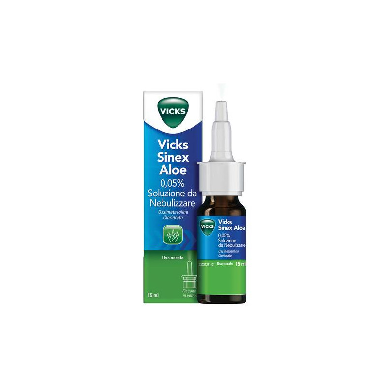 AVVERTENZE Impiegare con cautela nei primi mesi di gravidanza e, per il pericolo di ritenzione urinaria, negli anziani. Impiegare con cautela anche nei pazienti con angina e diabete. Se i sintomi persistono si deve considerare una rivalutazione clinica, in ogni caso, il trattamento non deve essere protratto per oltre 4 giorni consecutivi per evitare un effetto rebound e fenomeni di rinite indotti dal farmaco. Attenersi con scrupolo alle dosi consigliate. L'ingestione accidentale puo' provocare sedazione spiccata. Non deve essere usato oralmente. Evitare il contatto del liquido con gli occhi. L'uso protratto dei vasocostrittori puo' alterare la normale funzione della mucosa del naso e dei seni paranasali, inducendo anche assuefazione al farmaco. Ripetere le applicazioni per lunghi periodi puo' risultare dannoso. L'uso, specie se prolungato, dei prodotti topici puo' dare luogo a fenomeni di sensibilizzazione; in tal caso e' necessario interrompere il trattamento e istituire una terapia idonea. Informazioni importanti su alcuni eccipienti: Vicks Sinex Aloe 0,05% soluzione da nebulizzare contiene benzalconio cloruro puo' causare broncospasmo. Questo medicinale contiene 0.01 mg di benzalconio cloruro per dose (1 nebulizzazione) che equivalgono a 0.2 mg/ml. Benzalconio cloruro puo' causare irritazione e gonfiore all'interno del naso, specialmente se usato per lunghi periodi. Vicks Sinex Aloe 0,05% soluzione da nebulizzare contiene alcol benzilico. Questo medicinale contiene 0.1 mg di alcol benzilico per dose (1 nebulizzazione), equivalente a 2 mg/ml. L'alcol benzilico puo' causare reazioni allergiche. L'alcol benzilico puo' causare lieve irritazione locale. CATEGORIA FARMACOTERAPEUTICA Decongestionanti nasali ed altri preparazioni per uso topico, simpaticomimetici non associati. CONSERVAZIONE Questo medicinale non richiede alcuna condizione particolare di conservazione. CONTROINDICAZIONI/EFF.SECONDAR Ipersensibilita' al principio attivo o ad uno qualsiasi degli eccipienti elencati al paragrafo 6.1, ipertrofia prostatica, malattie cardiache ed ipertensione arteriosa gravi. Glaucoma, ipertiroidismo. Non somministrare durante e nelle due settimane successive a terapia con farmaci antidepressivi (IMAO). Infiammazione o lesioni della mucosa orale o della pelle intorno alle narici. Il farmaco e' controindicato nei bambini di eta' inferiore ai 12 anni. DENOMINAZIONE VICKS SINEX ALOE 0,05% SOLUZIONE DA NEBULIZZARE ECCIPIENTI Levomentolo, sodio citrato, acido citrico anidro, benzalconio cloruro soluzione, disodio edetato, eucaliptolo (cineolo), sorbitolo liquido non cristallizzabile, aloe vera, acesulfame potassico, Lcarvone, polisorbato 80, alcol benzilico e acqua depurata. EFFETTI INDESIDERATI Il prodotto se accidentalmente ingerito o se impiegato per lungo periodo in dosi eccessive, puo' determinare fenomeni tossici. Il prodotto puo' determinare localmente fenomeni di sensibilizzazione, e congestione delle mucose da rimbalzo. In generale non sono stati osservati effetti indesiderati severi. Per rapido assorbimento dell'ossimetazolina attraverso le mucose infiammate, si possono verificare effetti indesiderati suddivisi con le frequenze seguenti: molto comune (>=1/10); comune (>=1/100, <1/10); non comune (>=1/1000, <1/100); raro (>=1/10000, <1/1000); molto raro (>1/10000); non nota (la frequenza non puo' essere definita sulla base dei dati disponibili). Raro. Patologie dell'occhio: irritazione degli occhi, fastidio o rossore. Patologie respiratorie, toraciche e mediastiniche: fastidio o irritazione del naso, della bocca o della gola, starnuti. Molto raro. Patologie cardiache: tachicardia, palpitazioni, innalzamento della pressione arteriosa, bradicardia riflessa. Patologie del sistema nervoso centrale: insonnia, nervosismo, tremore, ansia, agitazione, irritabilita' e cefalea. Patologie gastrointestinali: nausea. Patologie renali e urinarie: disturbi della minzione. Segnalazione delle reazioni avverse sospette. La segnalazione delle reazioni avverse sospette che si verificano dopo l'autorizzazione del medicinale e' importante, in quanto permette un monitoraggio continuo del rapporto beneficio/rischio del medicinale. Agli operatori sanitari e' richiesto di segnalare qualsiasi reazione avversa sospetta tramite il sistema nazionale di segnalazione all'indirizzo https://www.aifa.gov.it/content/segnalazioni-reazioni-avverse. GRAVIDANZA E ALLATTAMENTO Non ci sono studi sull'uso del prodotto durante la gravidanza e l'allattamento. Usare con cautela nei primi mesi di gravidanza. La somministrazione deve essere presa in considerazione solo se il beneficio atteso per la madre supera il rischio per il bambino. INDICAZIONI Decongestionante della mucosa nasale, specie in caso di raffreddore. INTERAZIONI Esiste la possibilita' di interazione tra ammine simpaticomimetiche come l'ossimetazolina con farmaci anti-MAO per cui si sconsiglia l'uso durante o nelle due settimane successive a trattamento con farmaci anti-MAO (vedere paragrafo 4.3). L'ossimetazolina potrebbe ridurre l'efficacia dei farmaci beta-bloccanti, metil dopa o altri farmaci antiipertensivi. Potrebbero verificarsi fenomeni di ipertensione e di aritmie quando gli antidepressivi triciclici vengono somministrati con farmaci simpaticomimetici come l'ossimetazolina. Puo' verificarsi un aumento della tossicita' cardiovascolare quando i farmaci simpaticomimetici vengono somministrati in concomitanza di farmaci antiparchinsoniani come le bromocriptine. POSOLOGIA Adulti e bambini oltre i 12 anni: 1-2 nebulizzazioni per narice ogni 8 - 12 ore, salvo diversa indicazione del medico. Tenere il flacone in posizione verticale, introdurre nella narice la sua estremita' e premere il nebulizzatore con moto rapido e deciso. Dopo l'applicazione, inspirare profondamente a bocca chiusa. PRINCIPI ATTIVI Principio attivo: ossimetazolina cloridrato 0,0500% p/v. 1 ml di prodotto contiene 0,5 mg di ossimetazolina cloridrato. 1 nebulizzazione (50 microlitri) contiene circa 25 micr