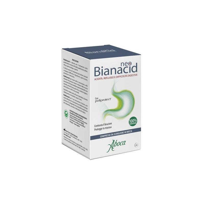 NeoBianacid Acidità e Reflusso è un prodotto a base di complessi molecolari vegetali e minerali, che svolge un'azione protettiva e lenitiva della mucosa gastro-esofagea, utile per contrastare rapidamente il bruciore, il dolore, la sensazione di acidità, ovvero i sintomi tipici dell'irritazione e dell'infiammazione della mucosa stessa.