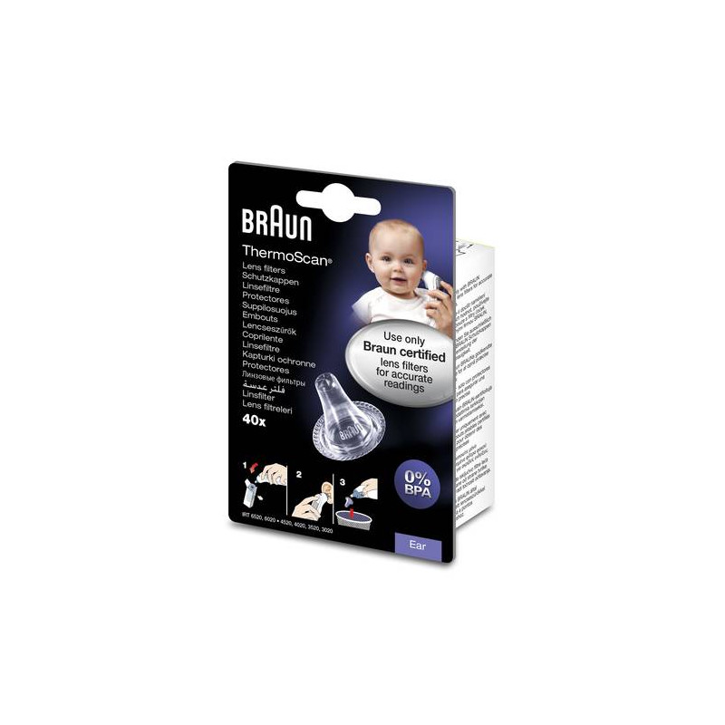 La sostituzione dei tappi igienici dopo ogni utilizzo garantisce la pulizia senza deposito di cerume e sporcizia, che potrebbero intasare il sensore. Se cambiati dopo ogni utilizzo, i tappi igienici usa e getta Braun aiutano a proteggere dalle contaminazioni incrociate. I Hygiene caps possono essere usati con tutti i modelli di termometri auricolari Braun ThermoScan IRT.