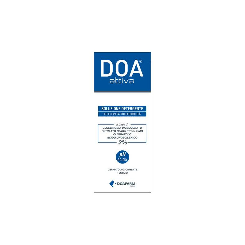 DOA attiva SOLUZIONE DETERGENTE Soluzione detergente idratante (degli strati superficiali dell'epidermide), lenitiva e purificante, ad elevata tollerabilità indicata come normalizzante nelle alterazioni del pH cutaneo, per una corretta igiene quotidiana del viso, di tutto il corpo ed in modo particolare in tutte le applicazioni indicate dal dermatologo.