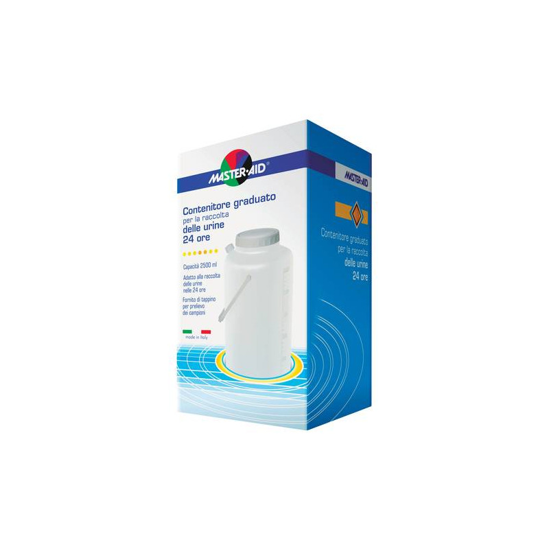 Prodotto a tanica, per la raccolta delle urine nelle 24 ore, con scala graduata, coperchio a vite, tappo per il prelievo. Provvisto di etichetta adesiva preapplicata, per l'identificazione del campione. Dispositivo IVD.