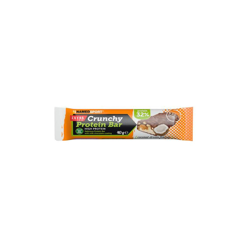 Barretta proteica con croccante copertura di cioccolato al latte.
