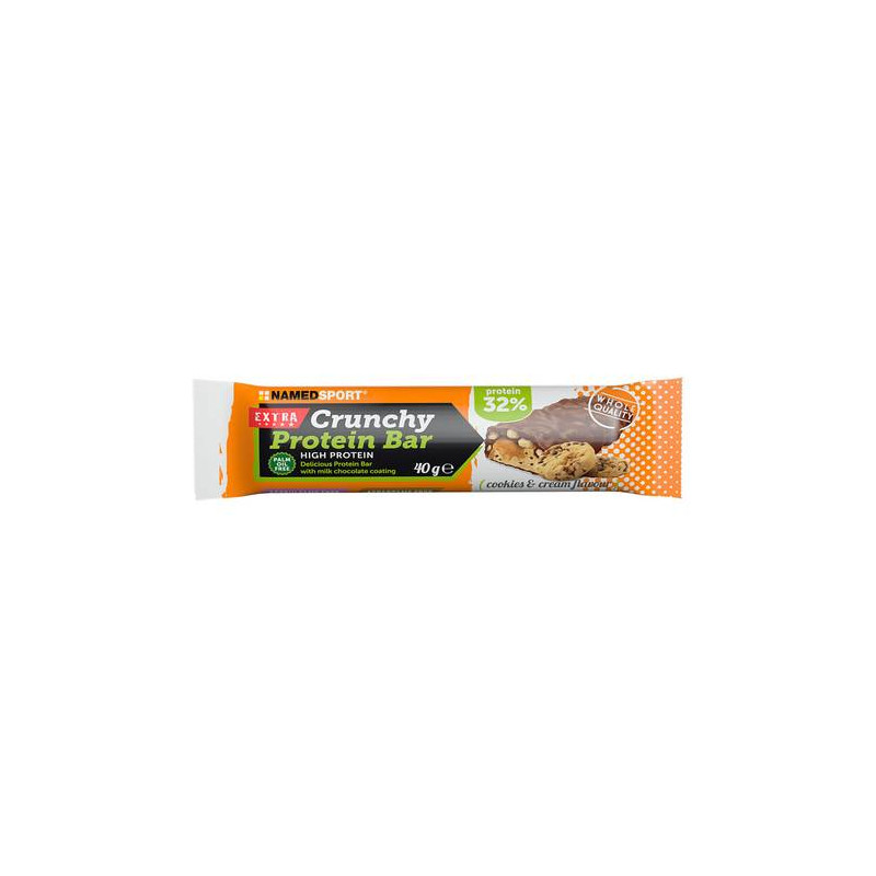 Barretta proteica con croccante copertura di cioccolato al latte.