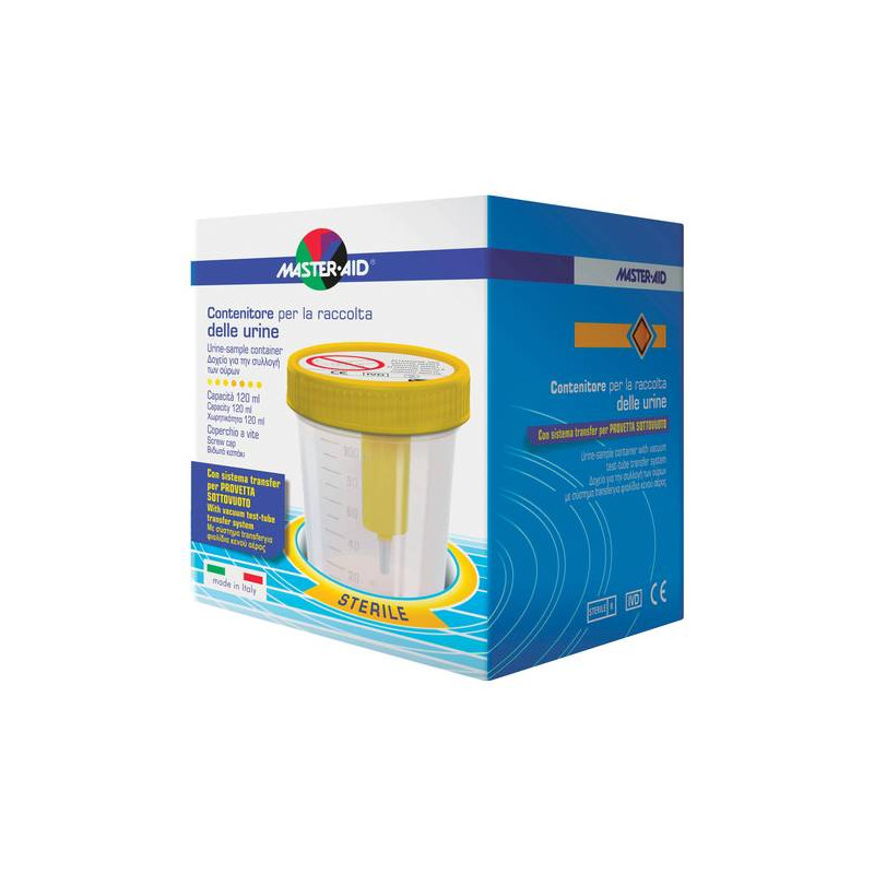 Prodotto per le analisi delle urine, con scala graduata e coperchio a vite. Provvisto di etichetta adesiva preapplicata, per l'identificazione del campione. Sterilizzato a raggi beta.