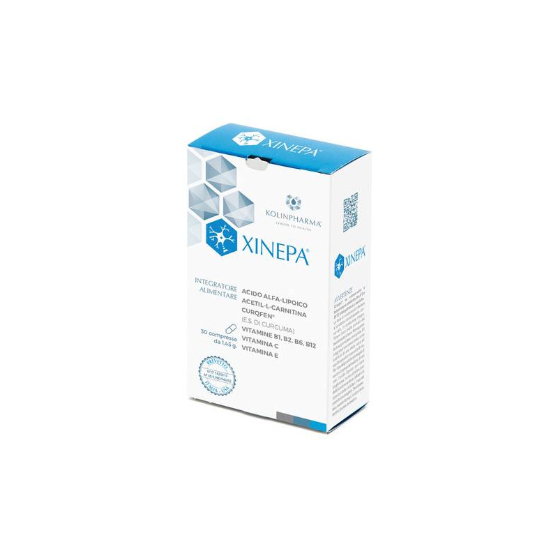 Xinepa è un integratore alimentare a base di acido alfa-lipoico, acetil-L-carnitina, curcuma, vitamine B, E e C. Le vitamine B1, B2, B6 e B12 contribuiscono al normale funzionamento del sistema nervoso e del metabolismo energetico. Le vitamine B2, B6 e B12, inoltre, sono di valido aiuto nei casi di stanchezza ed affaticamento. Curcuma, vitamina C ed E sono fattori di protezione delle cellule dallo stress ossidativo.