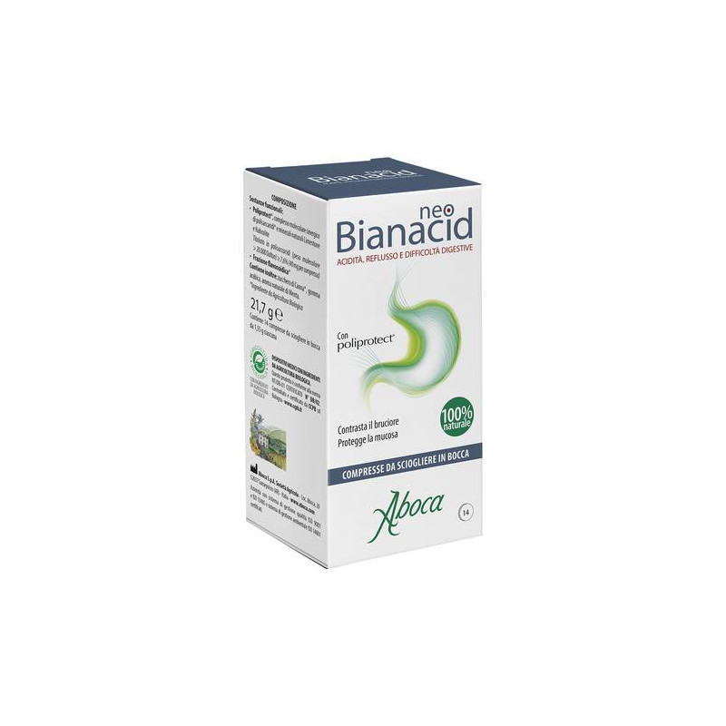 NeoBianacid Acidità e Reflusso è un prodotto a base di complessi molecolari vegetali e minerali, che svolge un'azione protettiva e lenitiva della mucosa gastro-esofagea, utile per contrastare rapidamente il bruciore, il dolore, la sensazione di acidità, ovvero i sintomi tipici dell'irritazione e dell'infiammazione della mucosa stessa.
