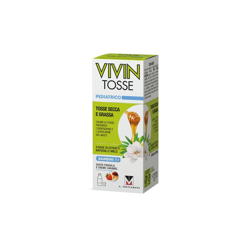 Dispositivo medico a base di piantaggine, altea e miele, in grado di creare un film protettivo che calma la tosse proteggendo le prime vie aeree. Grazie alla presenza di estratti vegetali di dimostrata efficacia Vivin Tosse Pediatrico agisce creando una barriera protettiva che limita il contatto delle vie respiratorie con gli agenti esterni ad azione irritante, migliorando la funzionalità delle prime vie respiratorie, soprattutto nei periodi invernali, o quando fenomeni irritativi dovuti ad agenti esterni (freddo, smog, polvere e fumo), lo rendono necessario.
