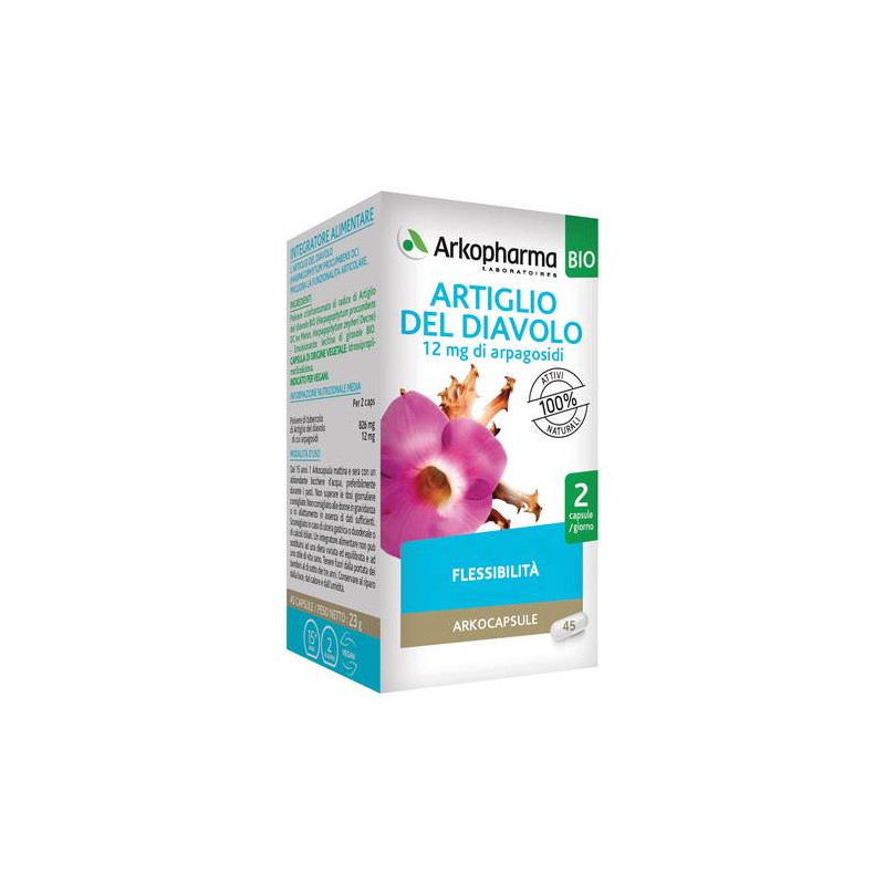Polvere criofrantumata di radice di Artiglio del diavolo BIO* (Harpagophytum procumbens DC ex Meisn, Harpagophytum zeyheri Decne) 413 mg, Concentrato di riso BIO (Oryza sativa L.). Capsula di origine vegetale: idrossipropilmetilcellulosa.