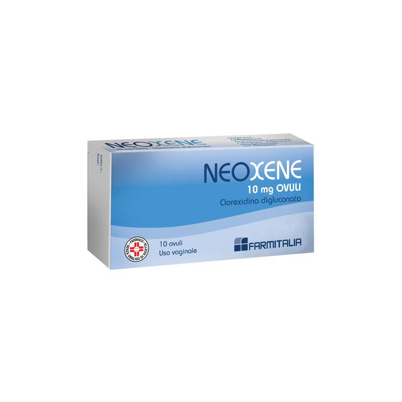 AVVERTENZE Non usare per i trattamenti prolungati. Dopo breve periodo di trattamento senza risultati apprezzabili consultare il medico. L'ingestione o l'inalazione accidentale di alcuni disinfettanti puo' avere conseguenze gravi, talvolta fatali. L'uso, specie prolungato, dei prodotti per uso topico puo' dare origine a fenomeni di sensibilizzazione; in tal caso interrompere il trattamento e consultare il medico per istituire un'idonea terapia. Neoxene e' per solo uso vaginale e non deve essere ingerito. Dopo l'applicazione di Neoxene e' consigliato lavarsi le mani, in caso di contatto con gli occhi risciacquare immediatamente con abbondante acqua. Questo medicinale contiene propileparaidrossibenzoato, etileparaidrossibenzoato come eccipienti pertanto puo' essere lievemente irritante per la cute, gli occhi e le mucose. Tenere il medicinale fuori dalla portata dei bambini. CATEGORIA FARMACOTERAPEUTICA Antimicrobici ed antisettici ginecologici. CONSERVAZIONE Non conservare a temperatura superiore a 25 gradi C. Conservare nella confezione originale per proteggere il medicinale dalla luce. CONTROINDICAZIONI/EFF.SECONDAR Ipersensibilita' al principio attivo o ad uno qualsiasi degli eccipienti. DENOMINAZIONE NEOXENE 10 MG OVULI ECCIPIENTI Glicerina, gelatina, propile paraidrossibenzoato, etile paraidrossibenzoato, blu Patent (E 131), acqua depurata. EFFETTI INDESIDERATI E' possibile il verificarsi, in qualche caso, di intolleranza (bruciore o irritazione), peraltro priva di conseguenze, che non richiede modifica del trattamento. Nei confronti della clorexidina e' stato riportato qualche raro caso di idiosincrasia. Segnalazione delle reazioni avverse sospette. La segnalazione delle reazioni avverse sospette che si verificano dopo l'autorizzazione del medicinale e' importante, in quanto permette un monitoraggio continuo del rapporto beneficio/rischio del medicinale. Agli operatori sanitari e' richiesto di segnalare qualsiasi reazione avversa sospetta tramite il sistema nazionale di segnalazione all'indirizzo www.agenziafarmaco.gov.it/it/responsabili. GRAVIDANZA E ALLATTAMENTO Il medicinale va usato solo in caso di effettiva necessita', sotto il diretto controllo del medico. INDICAZIONI Disinfezione della mucosa vaginale. INTERAZIONI Evitare l'uso contemporaneo di altri antisettici e detergenti. POSOLOGIA Uno, massimo due ovuli al giorno per una durata massima di dieci giorni consecutivi. NON SUPERARE LE DOSI CONSIGLIATE. PRINCIPI ATTIVI Ogni ovulo contiene: principio attivo: CLOREXIDINA DIGLUCONATO mg 10. Eccipienti: propileparaidrossibenzoato, Etileparaidrossibenzoato. Per l'elenco completo degli eccipienti, vedere paragrafo 6.1