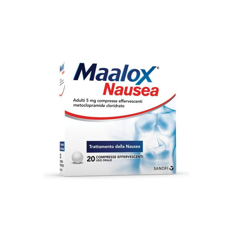 Disturbi neurologici: si possono verificare disturbi extrapiramidali,in particolare nei bambini e nei giovani adulti e/o con l'uso di dosielevate. Queste reazioni si verificano in genere all'inizio del trattamento e possono verificarsi dopo una singola somministrazione. La metoclopramide deve essere immediatamente sospesa in caso di sintomi extrapiramidali. Questi effetti sono generalmente del tutto reversibili dopo l'interruzione del trattamento ma possono richiedere un trattamentosintomatico (benzodiazepine nei bambini e/o farmaci anticolinergici eantiparkinsoniani negli adulti). Deve essere rispettato l'intervallo di tempo di almeno 6 ore fra due somministrazioni, come specificato nelparagrafo 4.2, anche in caso di vomito e rigetto della dose, al finedi evitare casi di sovradosaggio. Il trattamento prolungato con metoclopramide puo' causare discinesia tardiva, potenzialmente irreversibile, in particolare negli anziani. La durata del trattamento non dovrebbesuperare i 3 mesi a causa del rischio di discinesia tardiva (vedere paragrafo 4.8). Il trattamento deve essere interrotto se compaiono sintomi di discinesia tardiva. E' stata segnalata la sindrome neuroletticamaligna con metoclopramide in associazione ai neurolettici come anchein monoterapia con metoclopramide (vedere paragrafo 4.8). In caso disintomi di sindrome neurolettica maligna, la metoclopramide deve essere interrotta immediatamente e deve essere istituito il trattamento adeguato. Occorre particolare cautela in pazienti con patologie neurologiche concomitanti e in pazienti trattati con altri farmaci che agisconosul sistema nervoso centrale (vedere paragrafo 4.3). I sintomi del morbo di Parkinson possono essere esacerbati dalla metoclopramide. Metaemoglobinemia: e' stata riportata metaemoglobinemia possibilmente correlata al deficit di NADH citocromo b5 reduttasi. In tali casi, la metoclopramide deve essere interrotta immediatamente e permanentemente e devono essere adottate appropriate misure (come il trattamento con blu di metilene). Patologie cardiache: metoclopramide puo' indurre torsionedi punta, pertanto si deve prestare particolare cautela nella somministrazione del farmaco nei pazienti per i quali e' noto un fattore di rischio per il prolungamento dell'intervallo QT come: bilancio elettrolitico alterato (esempio ipokaliemia, ipomagnesiemia); sindrome congenita del QT lungo; bradicardia; l'uso concomitante di farmaci noti per prolungare l'intervallo QT come antiaritmici di classe IA e III, antidepressivi triciclici, macrolidi, antipsicotici (vedere paragrafo 4.5).Insufficienza renale ed epatica: nei pazienti con insufficienza renaleo con grave insufficienza epatica, si raccomanda una riduzione del dosaggio (vedere paragrafo 4.2). Particolare cautela deve essere adottata nell'usare il prodotto in pazienti contemporaneamente trattati con fenotiazine poiche' anche questi farmaci, come la metoclopramide, possono determinare la comparsa di sintomi extrapiramidali (vedere paragrafo 4.3). Informazioni importanti su alcuni eccipienti. Maalox nausea Adulti 5 mg compresse effervescenti contiene: circa 66 mg di sodio per compressa effervescente, equivalente al 3,3% dell'assunzione massima giornaliera raccomandata dall'OMS, che corrisponde a 2 g di sodio per unadulto; 192 mg di sorbitolo per compressa effervescente. L'effetto additivo della co-somministrazione di medicinali contenenti sorbitolo (ofruttosio) e l'assunzione giornaliera di sorbitolo (o fruttosio) conla dieta deve essere considerato. Il contenuto di sorbitolo in medicinali per uso orale puo' modificare la biodisponibilita' di altri medicinali per uso orale co-somministrati. Ai pazienti con intolleranza ereditaria al fruttosio non deve essere somministrato questo medicinale; 6,44 mmol di potassio per compressa effervescente. Da tenere in considerazione in pazienti con ridotta funzionalita' renale o in pazienti cheseguono una dieta a basso contenuto di potassio. Maalox nausea Adulti5 mg granulato effervescente contiene: 3,95 g di saccarosio per bustina: i pazienti affetti da rari problemi ereditari di intolleranza al fruttosio, da malassorbimento di glucosio-galattosio o da insufficienzadi sucrasi-isomaltasi non devono assumere questo medicinale; 157,55 mg di sodio per bustina equivalente al 7,9% dell'assunzione massima giornaliera raccomandata dall'OMS, che corrisponde a 2 g di sodio per unadulto. Non usare per trattamenti prolungati. Dopo massimo 3 giorni ditrattamento senza risultati apprezzabili consultare il medico. Come per i neurolettici, si puo' verificare una sindrome maligna da neurolettici (NMS) caratterizzata da ipertermia, disturbi extrapiramidali, instabilita' del sistema nervoso autonomico ed aumento del CPK. Pertantoe' necessaria cautela in caso di comparsa di febbre, uno dei sintomi di NMS, e metoclopramide va sospesa in caso di sospetto di NMS. Metoclopramide non e' consigliata nei pazienti epilettici poiche' le benzamidi possono abbassare la soglia epilettica. Non e' raccomandato l'uso nella fascia di eta' 16-18. Il possibile incremento dei livelli di prolattina dovrebbe essere attentamente considerato, in particolare nei pazienti affetti da tumore al seno o da adenoma ipofisario secernente prolattina. E' sconsigliato l'uso concomitante della metoclopramide con bevande alcoliche.