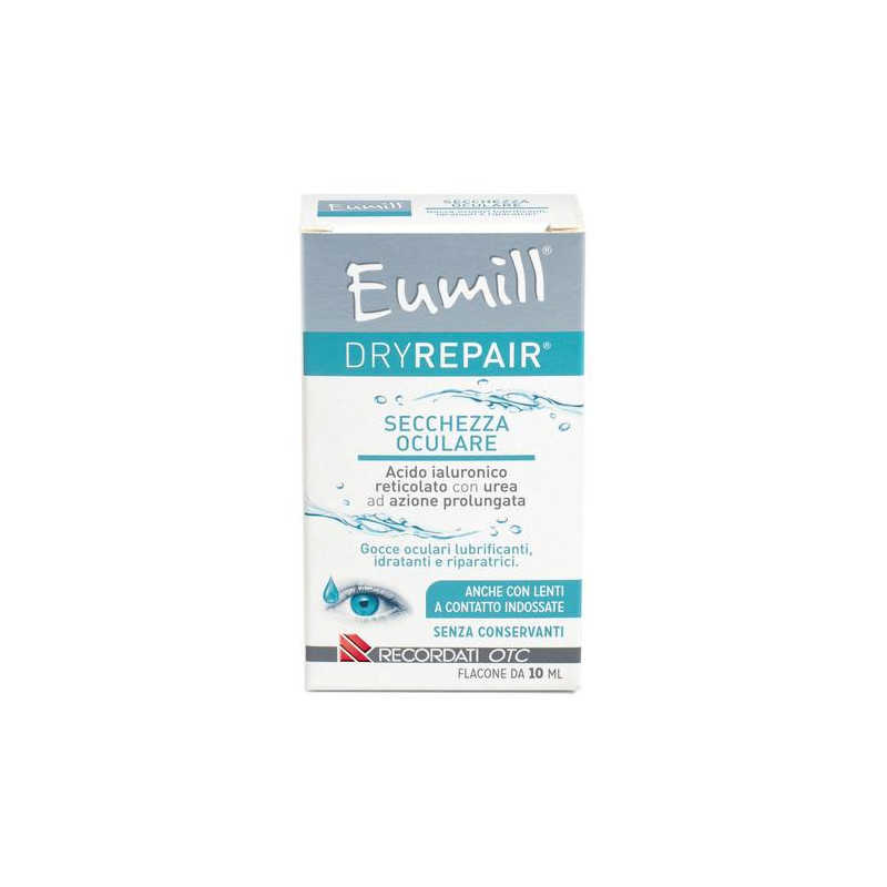 Soluzione sterile per uso oftalmico a pH fisiologico a base di acido ialuronico reticolato con urea, secondo una tecnologia brevettata, così da aumentare e migliorare le naturali proprietà meccaniche dell'acido ialuronico, rendendolo in grado di resistere più a lungo alla degradazione da parte delle ialuronidasi rispetto all'acido ialuronico naturale. La struttura reticolata che l'acido ialuronico forma offre idratazione ed è in grado di trattenere a lungo le molecole di acqua in modo da migliorare le intrinseche proprietà lubrificanti dell'acido ialuronico mentre, aumentando al contempo la sua azione idratante, è indicato come adiuvante nella sindrome dell'occhio secco. L'acido ialuronico reticolato è inoltre efficace nel contrastare radicali liberi e nell'esercitare un'azione riepitelizzante per una maggiore protezione della superficie corneale. L'acido ialuronico reticolato conferisce al prodotto proprietà lubrificanti, idratanti e riparatrici; è inoltre in grado di alleviare la secchezza oculare dovuta alla sindrome dell'occhio secco e donare sollievo in caso di stanchezza o irritazione oculare determinata da processi infiammatori o condizioni ambientali. Eumill DryRepair allevia rossore, secchezza, fatica e discomfort oculare causati da sindrome dell'occhio secco, fattori ambientali come vento, fumo, inquinamento, prolungata esposizione alla luce solare, salsedine, acqua di mare o piscina, studio o lavoro intensi, prolungato utilizzo del computer, lunghi periodi di guida, problematiche di lacrimazione generate da processi infiammatori, chirurgia oculare o chirurgia estetica palpebrale e blefariti croniche. Idrata e lubrifica la cornea e la congiuntiva in caso di secchezza oculare dovuta all'uso di lenti a contatto. Questa formula è stata sviluppata per donare il massimo comfort già dai primi istanti dopo l'applicazione. È indicata per un utilizzo quotidiano sia diurno che notturno. Non contiene conservanti e/o molecole ad azione anti-infiammatoria o vaso-costrittrice.