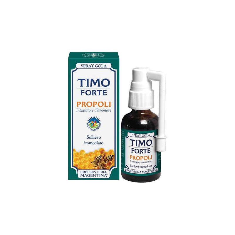 Estratto idroalcolico di propoli (alcol, acqua, propolis in rapporto D/E 1:10), estratto idroglicerico di propoli (stabilizzante: glicerolo; acqua, propoli 50%), estratto acquoso di timo (fruttosio, acqua, (Thymus vulgaris L.) foglie e fiori in rapporto D/E 1:4), erisimo e.s. (Sisymbrium officinale (L.) Scop.) sommità fiorite, altea (Althaea officinalis L.) radice e.s., olio essenziale di: eucalipto (Eucalyptus globulus Labill.), menta piperita (Mentha piperita L.), mirra (Commiphora myrrha (Nees) Engl.) resina.