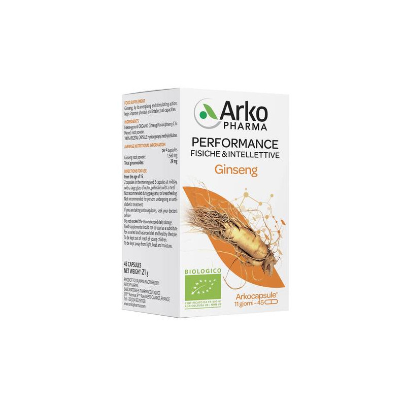Integratore alimentare a base di ginseng. Il ginseng, con la sua azione energizzante e stimolante, aiuta a migliorare le capacità fisiche.