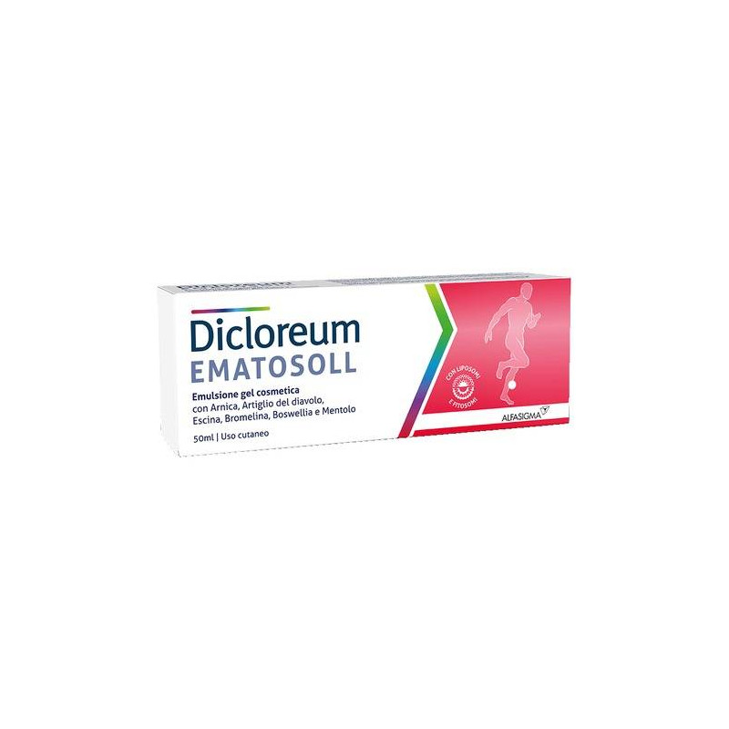 Gel cosmetico con arnica, artiglio del diavolo, escina, bromelina, boswellia e mentolo, studiato per favorire il benessere della pelle. In particolare, svolge un'azione lenitiva e agisce per mantenere le normali condizioni cutanee in caso di contrasti imprevisti che possono capitare durante le attività della vita quotidiana o sportiva. Dona un'immediata e prolungata sensazione di freschezza. Dicloreum Ematosoll gel è una formulazione innovativa in quanto alcune delle sostanze funzionali sono formulate in liposomi (bromelina) e fitosomi (escina e boswellia), che ne favoriscono l'efficacia e la permanenza a livello cutaneo. Si assorbe rapidamente, senza ungere.
