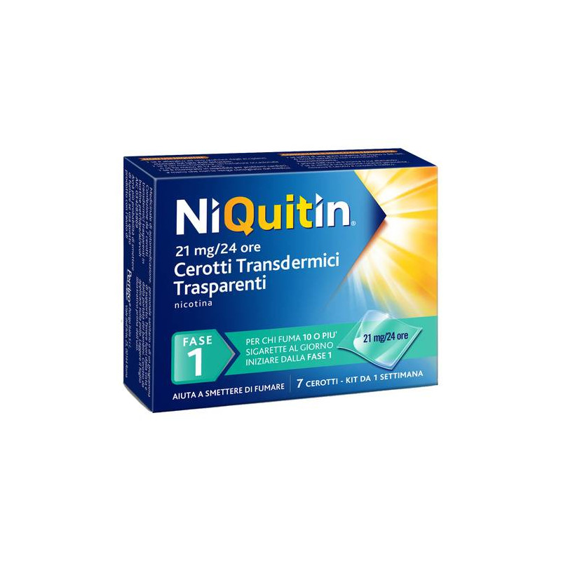Posologia. Adulti (dai 18 anni in su): i cerotti devono essere utilizzati come di seguito indicato. Prima di iniziare la terapia i soggetticandidati ad utilizzare nicotina per via transdermica devono desiderare di smettere di fumare. Durante un tentativo di smettere, deve esserefatto ogni sforzo per non fumare in corso di trattamento con NiQuitin. Si consiglia l'utilizzo di NiQuitin unitamente ad una terapia di supporto comportamentale, poiche' tale associazione ha dimostrato di apportare benefici nell'ambito della terapia per smettere di fumare. In alcuni casi (per esempio in forti fumatori o in coloro che hanno avuto una ricaduta dopo la TNS, o quando una TNS non e' sufficiente a controllare il desiderio di fumare - vedere paragrafo 4.1), puo' essere utileusare anche piu' di una forma di NiQuitin in concomitanza. Per esempio, fumatori che hanno difficolta' a controllare il desiderio di fumarequando si usa solo il cerotto possono usare pastiglia mini Niquitin/Niquitinmint per contrastare l'improvviso desiderio di fumare. NiQuitincerotti transdermici trasparenti possono essere utilizzati da soli oin combinazione con NiQuitin pastiglie mini/Niquitinmint far riferimento alla posologia della terapia in combinazione dettagliata sotto). NiQuitin deve essere applicato una volta al giorno, alla stessa ora e preferibilmente appena svegli e lasciato nel sito di applicazione per 24ore continuative. La terapia con NiQuitin normalmente inizia con l'applicazione di un cerotto da 21 mg/24 ore e in seguito viene ridotta secondo il seguente schema di trattamento. NiQuitin cerotti transdermicitrasparenti schema di trattamento. Dosaggio. Prima fase: niquitin 21mg/24 ore; durata:per le prime 6 settimane. Seconda fase: niquitin 14mg/24 ore; durata: per le 2 settimane seguenti. Terza fase: niquitin 7mg/24 ore; durata: per le ultime 2 settimane. Si raccomanda ai fumatori moderati (che fumano meno di 10 sigarette al giorno) di iniziare laterapia dalla seconda fase (14 mg) per 6 settimane e diminuire la dose utilizzando il cerotto da 7 mg/24 ore per le 2 settimane finali. I soggetti che utilizzano NiQuitin 21 mg/24 ore e soffrono di eccessivi effetti collaterali, che non si risolvono entro pochi giorni, devono cambiare cerotto ed utilizzare quello da 14 mg/24 ore. Tale dosaggio deve essere mantenuto per le rimanenti 6 settimane prima di passare all'uso di NiQuitin 7 mg/24 ore per 2 settimane. Se i sintomi persistono chiedere consiglio al personale sanitario. Per ottimizzare i risultati,il trattamento deve completarsi in 10 settimane (8 settimane per i fumatori moderati o per quei pazienti che hanno ridotto il dosaggio comesopra indicato). Il trattamento con NiQuitin puo' essere esteso oltre10 settimane se e' necessario per mantenere l'astensione dal fumo, comunque chi utilizza i cerotti oltre i 9 mesi deve consultare il personale sanitario. I soggetti che continuano o riprendono a fumare possonoeffettuare ulteriori cicli di trattamento con NiQuitin. Terapia in combinazione; trattamento con NiQuitin cerotti transdermici trasparenti in combinazione con NiQuitin pastiglie mini/Niquitimint. I fumatori possono combinare i cerotti transdermici e le forme orali di nicotina. Lacombinazione dei cerotti transdermici e le forme orali di nicotina danno una migliore efficacia rispetto all'utilizzo dei soli cerotti transdermici. Il trattamento dovrebbe iniziare con la determinazione delladose del cerotto, secondo le stesse regole della monoterapia (vedi sotto), in combinazione con una dose di nicotina orale. L'assunzione giornaliera delle preparazioni orali, quando combinate con i cerotti, e'raccomandata essere intorno a 5-6 pezzi. Quando utilizzate in combinazione, la dose massima giornaliera per le forme orali di 4 mg e' 10 pezzi e per le forme orali di 1,5mg/2mg rimane di 15 pezzi. Qualora fosserichiesto un prolungamento, consultare il personale sanitario. A causa dell'assenza di dati, gli adolescenti non devono interrompere la terapia combinata TNS. NiQuitin e' controindicato nei bambini sotto i 12anni. Modo di somministrazione: un nuovo cerotto transdermico trasparente NiQuitin deve essere applicato su una zona di cute glabra, pulitaed asciutta. Il cerotto va applicato subito dopo la rimozione del sacchetto protettivo. Il cerotto deve essere mantenuto sigillato nel suo sacchetto protettivo fino al suo utilizzo. Il cerotto va pressato con forza sulla pelle con il palmo della mano per 10 secondi. Aree dove sono presenti pieghe della pelle dovrebbero essere evitate. Evitare l'applicazione sulla cute ferita, infiammata o irritata. Dopo 24 ore il cerotto usato deve essere rimosso ed un nuovo cerotto applicato su una zona cutanea diversa dalla precedente. Il cerotto non deve essere lasciato applicato per piu' di 24 ore. Si puo' riutilizzare la stessa zona cutanea dopo almeno 7 giorni. Usare un solo cerotto per volta. I cerotti possono essere rimossi prima di dormire se si desidera. Tuttavia siconsiglia l'uso per 24 ore continuate, per ottimizzare l'effetto contro il desiderio mattutino di fumare. Particolare cura deve essere usatadurante l'impiego del cerotto per evitare il contatto con occhi e naso. Lavarsi le mani dopo l'applicazione solo con acqua poiche' il sapone puo' aumentare l'assorbimento della nicotina.