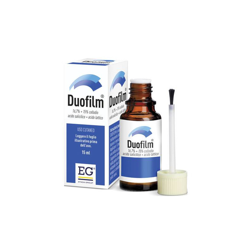 AVVERTENZE L'impiego, specie se prolungato, di prodotti per uso topico puo' dare origine a fenomeni di sensibilizzazione. In tal caso e' necessario interrompere il trattamento e istituire un'idonea terapia. Applicare DUOFILM solo sulle verruche senza debordare sulla cute sana circostante. Il medicinale puo' provocare irritazione agli occhi. Evitare il contatto con gli occhi e altre mucose. Se accidentalmente il prodotto venisse a contatto con mucose o con gli occhi, sciacquare subito ed abbondantemente con acqua, rimuovere la pellicola di collodio che si forma e continuare a sciacquare con acqua per almeno un quarto d'ora. Evitare l'applicazione sulla pelle sana (vedere Effetti indesiderati). Il medicinale puo' provocare irritazione della pelle. Qualora si sviluppi una inaspettata irritazione della pelle, il trattamento deve essere interrotto. Si prenda in considerazione un trattamento alternativo qualora le verruche coprano un'area estesa del corpo (piu' di 5 cm^2) a causa della potenziale tossicita' dei salicilati. Il medicinale non e' raccomandato in pazienti diabetici o con problemi circolatori o neuropatia periferica, se non sotto la supervisione di un medico. L'assunzione di salicilati orali durante o immediatamente dopo una malattia virale e' stata associata alla sindrome di Reye e di conseguenza vi e' un rischio teorico anche con salicilati per uso topico. Quindi, il prodotto non deve essere utilizzato in bambini o adolescenti durante o immediatamente dopo varicella, influenza o altre infezioni virali. E' stato riportato che i salicilati sono escreti nel latte materno (vedere Fertilita', gravidanza e allattamento). I pazienti devono essere avvertiti di non inalare i vapori. L'ingestione accidentale di cheratolitici contenenti acido salicilico ed acido lattico ad elevata concentrazione puo' avere conseguenze gravi, talvolta fatali. Il prodotto non deve essere impiegato per prevenire la formazione delle verruche. Non ingerire. Tenere fuori dalla vista e dalla portata dei bambini. Questo medicinale contiene 2228 mg di alcool (etanolo) in ogni unita' di volume che e' equivalente a 158 mg/g. Puo' causare sensazione di bruciore sulla pelle danneggiata. CATEGORIA FARMACOTERAPEUTICA Preparati per calli e verruche. CONSERVAZIONE Per l'alta infiammabilita' si consiglia di conservare il prodotto a temperature non superiori ai 25 gradi C. al riparo da fiamme e fonti di calore. Richiudere bene il flacone dopo l'uso. Un notevole aumento di densita' del prodotto indica che il flacone non e' stato chiuso appropriatamente e che il solvente in esso contenuto e' parzialmente evaporato. CONTROINDICAZIONI/EFF.SECONDAR Il medicinale e' controindicato nei pazienti con precedente reazione di ipersensibilita' ai principi attivi o ad uno qualsiasi degli eccipienti elencati al paragrafo 6.1. Non usare su ferite aperte, pelle irritata o arrossata o qualsiasi area infetta. DUOFILM, non va applicato sul viso, sulla zona ano-genitale e su aree di grandi dimensioni. Il prodotto non deve essere applicato su nevi, voglie, verruche seborroiche, condilomi, verruche del viso o delle mucose, o verruche con peli, circondate da bordi rossi o di colore insolito. DENOMINAZIONE DUOFILM 16,7% + 15% COLLODIO ECCIPIENTI Il solo eccipiente di DUOFILM e' il collodio elastico BP, costituito da: colofonia, olio di ricino e collodio, a sua volta costituito da pirossilina, alcool etilico e etere. GRAVIDANZA E ALLATTAMENTO Gravidanza: la sicurezza d'uso in gravidanza della soluzione di acidosalicilico e acido lattico non e' accertata. Studi su animali ai qualie' stato somministrato acido salicilico per via orale hanno dimostrato embrio-tossicita' ad alte dosi (vedere Dati preclinici di sicurezza). Il medicinale non e' raccomandato durante la gravidanza. Allattamento: i salicilati sono escreti nel latte materno. Il medicinale non e' raccomandato durante l'allattamento. Se usato o somministrato durante l'allattamento, evitare il contatto con l'area del seno per impedire l'ingestione accidentale da parte del lattante. INDICAZIONI DUOFILM e' indicato per il trattamento topico di verruche, calli e duroni. INTERAZIONI La soluzione per uso topico di acido salicilico e acido lattico puo' incrementare l'assorbimento di altri medicinali per uso topico. Quindi l'uso concomitante della soluzione di acido salicilico e acido lattico e di altri medicinali per uso topico sull'area trattata deve essere evitato. Dal momento che l'assorbimento sistemico delle soluzioni ad uso topico di acido salicilico e acido lattico e' basso, non e' attesa l'interazione con medicinali somministrati per via sistemica. POSOLOGIA Solo per uso topico. Adulti, compresi gli anziani: DUOFILM deve essere applicato mediante l'apposito pennellino solo sulla parte interessata, evitando che il liquido venga a contatto con la pelle sana. DUOFILM deve essere applicato sulla verruca, sul callo o sul durone una volta al giorno, preferibilmente la sera prima di andare a letto, attenendosi alle seguenti istruzioni d'uso: 1. Immergere in acqua calda per circa 5 minuti la parte da trattare e asciugare accuratamente con un asciugamano pulito. 2. Passare sulla superficie interessata una limetta per le unghie, una pietra abrasiva, una limetta di cartone o una salvietta ruvida, avendo cura di non provocare sanguinamento. 3. Applicare con l'apposito pennellino DUOFILM sulla verruca, sul callo o sul durone, avendo cura di non debordare sulla cute sana circostante. 4. Lasciare asciugare completamente la soluzione: nel caso di forme localizzate ai piedi o qualora la verruca, il callo o il durone coinvolgano aree estese si deve coprire la parte con un cerotto per favorire l'assorbimento dei principi attivi. Si raccomanda di continuare il trattamento fino a che non si verifichi una delle seguenti condizioni: i calli e i duroni sono stati trattati per 2 settimane; le verruche sono state trattate per 12 settimane; oppure fino a quando la verruca, il callo o il durone sono completamente rimossi e 