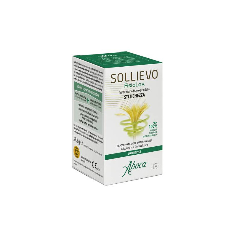 Sollievo FisioLax è un dispositivo medico 100% naturale indicato per il trattamento della stitichezza. L’azione del prodotto è ottenuta grazie all’insieme delle sostanze naturali presenti, che agiscono sulle molteplici funzioni utilizzate normalmente dall’intestino per regolare il transito. Sollievo FisioLax agisce quindi con un meccanismo di azione fisiologico e non farmacologico. Sollievo FisioLax è ottenuto attraverso processi di lavorazione completamente naturali che non utilizzano solventi o altre sostanze di sintesi chimica.