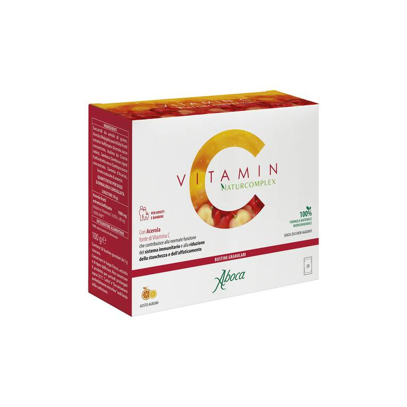 Vitamin C Naturcomplex è un integratore alimentare 100% naturale che fornisce la dose giornaliera consigliata di vitamina C insieme alle altre sostanze naturalmente presenti nell’estratto di acerola, come i flavonoidi tra cui quercetina e antocianine. Queste sostanze contribuiscono ad una biodisponibiltà ideale della vitamina C e ne completano il potere antiossidante. La vitamina C contribuisce: al buon funzionamento del sistema immunitario, alla riduzione della stanchezza e dell’affaticamento, alla protezione delle cellule dallo stress ossidativo e al normale funzionamento del sistema nervoso. Inoltre la vitamina C contribuisce alla normale formazione del collagene per la funzione di ossa, cartilagini, denti, gengive, pelle e accresce l’assorbimento del ferro.