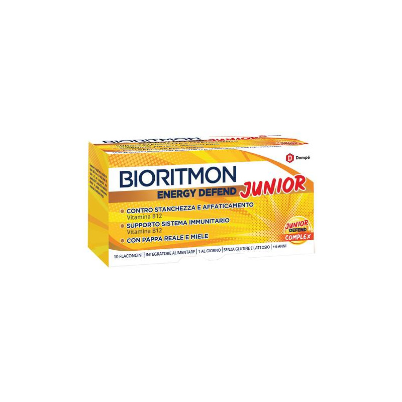 Bioritmon Energy Defend Junior è un integratore alimentare a base di vitamina B12, pappa reale e miele (Junior Defend Complex). La vitamina B12 contribuisce al normale metabolismo energetico, al normale funzionamento del sistema nervoso, alla normale funzione psicologica. Inoltre, contribuisce alla riduzione di stanchezza e affaticamento e al normale funzionamento del sistema immunitario. La pappa reale utilizzata per Bioritmon Energy Defend Junior è prodotta da alveari selezionati di zone controllate, liofilizzata con un processo che consente il mantenimento di tutte le proprietà anche a temperatura ambiente. La pappa reale è una sostanza complessa contenente una combinazione unica di proteine, zuccheri, lipidi, aminoacidi, vitamine e minerali. Il miele è un alimento prodotto dalle api con un ottimo valore nutrizionale, ricco di composti attivi (i polifenoli), polline, glucosio e fruttosio. Contiene anche oligoelementi come ferro, rame, manganese e silicio, vitamine ed enzimi. È fonte di energia pronto-uso.