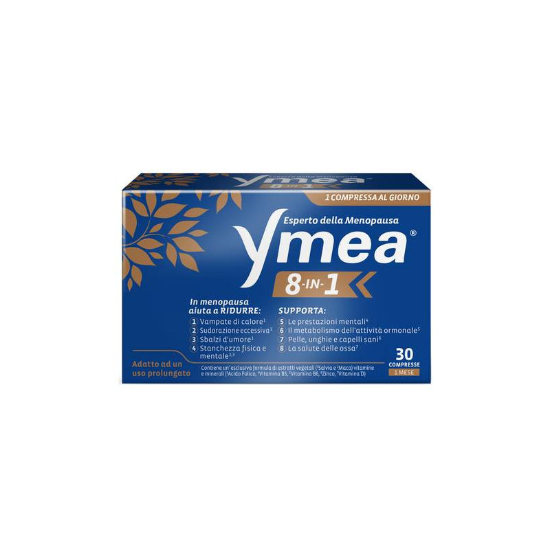 Ymea 8-in-l contiene un'esclusiva formula di estratti vegetali, vitamine e minerali. La salvia aiuta a moderare la sudorazione e i fastidi della menopausa come vampate di calore e sbalzi d'umore. La maca aiuta a contrastare la stanchezza fisica e mentale. La vitamina B12 contribuisce al normale metabolismo energetico. L'acido folico aiuta a ridurre stanchezza e affaticamento. La vitamina B5 aiuta a mantenere prestazioni mentali normali. La vitamina B6 contribuisce a regolare l'attività ormonale. Lo zinco contribuisce al mantenimento di pelle, capelli e unghie sane. La vitamina D3 contribuisce a mantenere ossa in salute. La vitamina D, C e lo zinco contribuiscono al normale funzionamento del sistema immunitario.