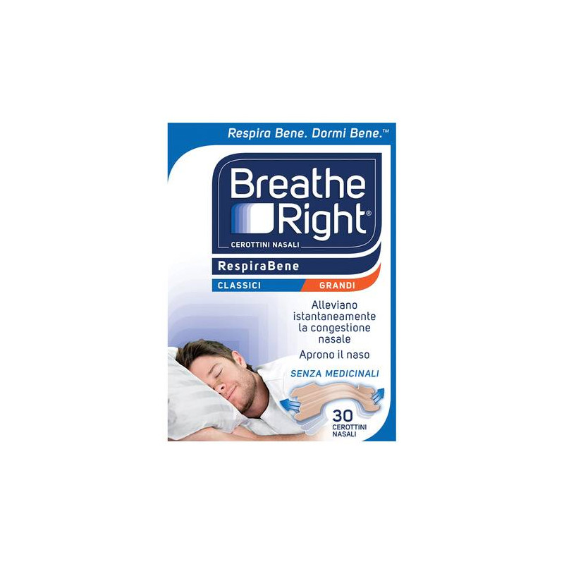 Breath Right RespiraBene è un dispositivo medico per adulti che aiuta a respirare meglio e a ridurre il russamento; i cerottini nasali Breath Right Respirabene allargano delicatamente i passaggi nasali, facilitando la respirazione in caso di congestione nasale, allergia o raffreddore.