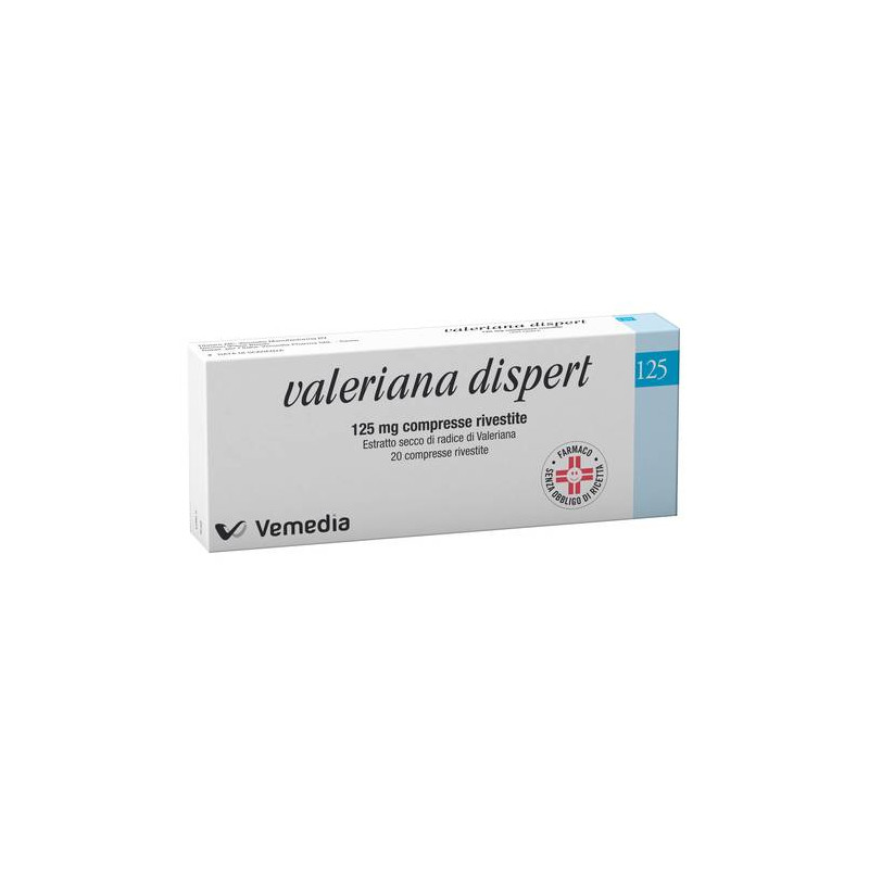 AVVERTENZE Il prodotto contiene lattosio e saccarosio. CATEGORIA FARMACOTERAPEUTICA Ipnotici e sedativi. CONSERVAZIONE Non conservare a temperatura superiore ai 30 gradi C. CONTROINDICAZIONI/EFF.SECONDAR Ipersensibilita' al principio attivo o ad uno qualsiasi degli eccipienti elencati; l'uso nei bambini al di sotto dei 12 anni e' sconsigliato, poiche' non sono disponibili dati sull'efficacia e sicurezza del farmaco in pediatria; generalmente controindicato in gravidanza e durante l'allattamento. DENOMINAZIONE VALERIANA DISPERT 125 MG COMPRESSE RIVESTITE ECCIPIENTI Destrina, cellulosa microcristallina, lattosio monoidrato, macrogol 4000, silice colloidale anidra, magnesio stearato, lacca, ipromellosa, talco, magnesio ossido leggero, gomma arabica, saccarosio, povidone K25, macrogol 6000, titanio diossido, carmellosa sodica, cera bianca, cera carnauba. EFFETTI INDESIDERATI Non sono noti effetti indesiderati da attribuire all'uso del medicinale alle condizioni raccomandate e per brevi periodi di tempo. La segnalazione delle reazioni avverse sospette che si verificano dopo l'autorizzazione del medicinale e' importante, in quanto permette un monitoraggio continuo del rapporto beneficio/rischio del medicinale. GRAVIDANZA E ALLATTAMENTO Poiche' non sono disponibili dati sull'uso durante la gravidanza e l'allattamento, in via precauzionale, ne e' generalmente sconsigliato l'uso. Non sono stati segnalati effetti avversi in seguito all'uso comune di radice di valeriana come medicinale, ma al riguardo mancano adeguati dati sperimentali. INDICAZIONI Medicinale a base di piante per il trattamento di stati di lieve e temporanea tensione nervosa e della temporanea difficolta' nel prendere sonno. INTERAZIONI Non sono state segnalate interazioni. Il paziente e' comunque invitato a chiedere consiglio al medico se sta assumendo altri farmaci. POSOLOGIA >>Adulti e bambini sopra i 12 anni. Dose singola: 4 compresse rivestite. Per la tensione nervosa: fino a 3 volte al giorno. Come aiuto per prendere sonno, una dose singola da mezz'ora a un'ora prima di coricarsi e, se necessario una dose in precedenza durante la serata. Anziani: come per gli adulti. Modo di somministrazione: uso orale. Le compresse devono essere inghiottite senza masticare. PRINCIPI ATTIVI Estratto secco di radice di valeriana preparato con etanolo 70 % v/v.