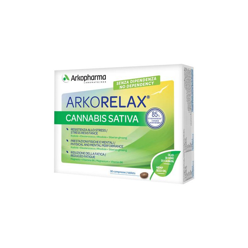 Integratore alimentare a base di piante, magnesio e vitamina B6. Arkorelax Cannabis Sativa aiuta naturalmente a restare sereni durante i periodi stressanti, nel rispetto dell’equilibrio naturale del corpo, grazie all’associazione di due piante adattogene (rodiola ed eleuterococco), al magnesio ed alla vitamina B6. Contiene olio di semi di canapa. La rodiola e l'eleuterococco sono piante adattogene che aiutano ad aumentare la resistenza dell’organismo allo stress. Esse contribuiscono al benessere emotivo ed allo svolgimento delle performance fisiche ed intellettive. Il magnesio e la vitamina B6 aiutano a ridurre la fatica e a mantenere un buon funzionamento del sistema nervoso L’olio di semi di canapa è riconosciuto per il suo apporto equilibrato in nutrienti attivi, soprattutto acidi grassi essenziali.