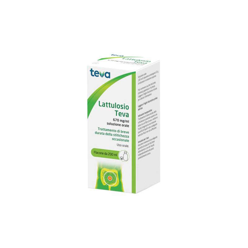 AVVERTENZE Avvertenze: l'abuso di lassativi (uso frequente o prolungato o con dosi eccessive) puo' causare diarrea persistente con conseguente perditadi acqua, sali minerali (specialmente potassio) e altri fattori nutritivi essenziali. Pertanto, lo stato di idratazione del paziente deve essere valutato attentamente. Nei casi piu' gravi e' possibile l'insorgenza di disidratazione o ipopotassiemia la quale puo' determinare disfunzioni cardiache o neuromuscolari, specialmente in caso di contemporaneo trattamento con glicosidi cardiaci, diuretici o corticosteroidi (vedere paragrafo 4.5). L'abuso di lassativi, specialmente quelli di contatto (lassativi stimolanti), puo' causare dipendenza (e, quindi, possibile necessita' di aumentare progressivamente il dosaggio), stitichezza cronica e perdita delle normali funzioni intestinali (atonia intestinale). Prima di iniziare il trattamento deve essere valutata una eventuale sintomatologia dolorosa addominale di causa sconosciuta al fine di escludere perforazioni od ostruzioni non diagnosticate o relative patologie/condizioni predisponenti non diagnosticate. Precauzioni d'impiego: in caso di insufficiente effetto terapeutico dopo diversi giorni,si consiglia di consultare un medico. Lattulosio Teva 670 mg/ml soluzione orale puo' contenere tracce di zuccheri derivanti dal procedimento di sintesi (non piu' di 67 mg/ml di lattosio, 100 mg/ml di galattosio, 67 mg/ml di epilattosio, 27 mg/ml di tagatosio e 7 mg/ml di fruttosio). Lattulosio Teva contiene tracce di lattosio e galattosio: i pazienti affetti da rari problemi ereditari di intolleranza al galattosio,ad es. galattosemia, da deficit totale di lattasi o da malassorbimentodi glucosio-galattosio, non devono assumere questo medicinale. Lattulosio Teva contiene tracce di fruttosio: l'effetto additivo della co-somministrazione di medicinali contenenti fruttosio (o sorbitolo) e l'assunzione di fruttosio (o sorbitolo) con la dieta deve essere considerato. La dose normalmente utilizzata non dovrebbe rappresentare un problema per i diabetici. In pazienti diabetici in corso di trattamento condosaggi elevati di lattulosio, potrebbe essere necessario aggiustarela posologia dei medicinali antidiabetici. 15 ml di Lattulosio Teva 670 mg/ml soluzione orale contengono 42,7 KJ (10,2 kcal) = 0,21 unita' di carboidrati. I pazienti con sindrome gastro-cardiaca (sindrome di Roemheld) devono assumere il lattulosio solo previa consultazione di unmedico. Se dopo l'assunzione di lattulosio, tali pazienti lamentano sintomi quali meteorismo o gonfiore, si deve ridurre la dose o interrompere il trattamento. L'uso cronico di dosi non adeguate e l'abuso del farmaco possono causare diarrea e disturbi del bilancio elettrolitico.Durante la terapia con lassativi si raccomanda di bere una quantita' sufficiente di liquidi (1,5 - 2 l/giorno, pari a 6 - 8 bicchieri). Il trattamento della stitichezza cronica o ricorrente richiede sempre l'intervento del medico per la diagnosi, la prescrizione dei farmaci e lasorveglianza nel corso della terapia. Consultare il medico quando la necessita' del lassativo deriva da un improvviso cambiamento delle precedenti abitudini intestinali (frequenza e caratteristiche delle evacuazioni) che duri da piu' di due settimane o quando l'uso del lassativonon riesce a produrre effetti. E' inoltre opportuno che i soggetti anziani o in non buone condizioni di salute consultino il medico prima diusare il medicinale. L'uso inappropriato a lungo termine di lattulosio in pazienti anziani o in pazienti che si trovano in cattive condizioni generali puo' alterare l'equilibrio elettrolitico. Popolazione pediatrica: nei bambini al di sotto dei 12 anni il medicinale puo' essereusato solo dopo aver consultato il medico. Il lattulosio va somministrato con cautela a neonati e bambini piccoli con intolleranza ereditaria al fruttosio autosomica recessiva. Il riflesso della defecazione potrebbe subire variazioni durante il trattamento con il lattulosio. CATEGORIA FARMACOTERAPEUTICA Lassativi ad azione osmotica. CONSERVAZIONE Conservare a temperatura inferiore a 25 gradi C. CONTROINDICAZIONI/EFF.SECONDAR Ipersensibilita' al principio attivo o ad uno qualsiasi degli eccipienti elencati al paragrafo 6.1); dolore addominale acuto o di origine sconosciuta; nausea o vomito; ostruzione o stenosi intestinale; sanguinamento rettale di origine sconosciuta; grave stato di disidratazione; malattia infiammatoria acuta intestinale (colite ulcerosa, morbo di Crohn), sindromi subocclusive, perforazione o rischio di perforazione dell'apparato digerente, sindromi addominali dolorose da causa indeterminata. DENOMINAZIONE LATTULOSIO TEVA 670 MG/ML SOLUZIONE ORALE ECCIPIENTI Acqua depurata. EFFETTI INDESIDERATI All'interno di ogni gruppo di frequenza sono riportati gli effetti indesiderati in ordine decrescente di gravita'. Molto comuni (>= 1/10); comuni (>= 1/100, < 1/10); non comuni (>= 1/1.000, < 1/100); rari (>= 1/10.000, < 1/1.000); molto rari (< 1/10.000); non nota (la frequenza non puo' essere definita sulla base dei dati disponibili). Disturbi delsistema immunitario. Non nota: reazioni da ipersensibilita'. Patologie gastrointestinali. Molto comuni: lieve dolore addominale*, flatulenza*; comuni: diarrea* con disturbi elettrolitici, vomito*, nausea*; nonnota: dolori crampiformi isolati o coliche addominali, piu' frequentinei casi di stitichezza grave**. Disturbi del metabolismo e della nutrizione. Rari: ipernatriemia; non nota: squilibrio elettrolitico dovuto alla diarrea. Patologie della cute e del tessuto sottocutaneo. Non nota: eruzione cutanea, prurito, orticaria. * prevalentemente in seguito a dosaggi eccessivi. ** prevalentemente compaiono durante i primi giorni di trattamento e normalmente scompaiono dopo alcuni giorni. Quando si assume una dose superiore a quella prescritta, possono compariredolore addominale e diarrea. In questo caso il dosaggio deve essere ridotto. Se dosi eccessive sono assunte per lunghi periodi, il pazientepuo' man