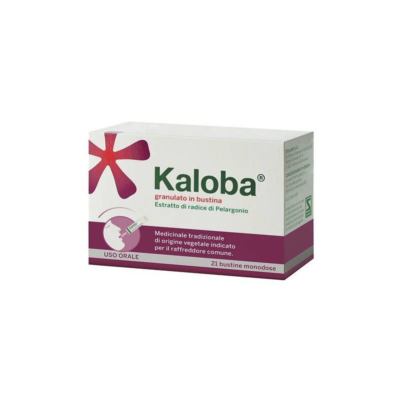 AVVERTENZE Sono stati riportati casi di epatotossicita' ed epatiti in associazione alla somministrazione del medicinale. In presenza di segni di epatotossicita' la somministrazione del medicinale deve essere interrotta immediatamente ed e' necessaria una rivalutazione del caso. Il trattamento deve essere interrotto anche in caso di tachipnea o di emottisi. CATEGORIA FARMACOTERAPEUTICA Preparati per la tosse e le malattie da raffreddamento. CONSERVAZIONE Questo medicinale non richiede alcuna condizione particolare di conservazione. CONTROINDICAZIONI/EFF.SECONDAR Ipersensibilita' al principio attivo o ad uno qualsiasi degli eccipienti elencati al paragrafo 6.1; tendenza al sanguinamento; assunzione difarmaci che inibiscono la coagulazione; insufficienza renale grave; insufficienza epatica grave. DENOMINAZIONE KALOBA GRANULATO IN BUSTINA ECCIPIENTI Maltodestrina, xilitolo, silice colloidale anidra. EFFETTI INDESIDERATI La valutazione delle reazioni avverse si basa sulle seguenti informazioni relative alla frequenza: molto comune: (> 1/10); comune: (>1/100,<1/10); non comune: (>1/1.000, <1/100); raro: (>1/10.000, <1/1.000); molto raro: (<1/10.000); non nota: la frequenza non puo' essere definita sulla base dei dati disponibili. Patologie gastrointestinali. Non comuni: mal di stomaco, bruciore di stomaco, nausea, vomito, disfagia ediarrea; rare: lieve sanguinamento gengivale. Patologie respiratorie,toraciche e mediastiniche. Rare: lieve sanguinamento nasale. Disturbidel sistema immunitario. Rare: reazioni di ipersensibilita' (reazioni-tipo-I con esantema, orticaria, prurito della cute e delle membrane mucose; reazioni-tipo-II con formazione di anticorpi); molto rare: gravireazioni di ipersensibilita' con gonfiore del viso, dispnea e calo della pressione del sangue. Patologie epatobiliari. Frequenza non nota:epatotossicita'. Segnalazione delle reazioni avverse sospettem. La segnalazione delle reazioni avverse sospette che si verificano dopo l'autorizzazione del medicinale e' importante, in quanto permette un monitoraggio continuo del rapporto beneficio/ rischio del medicinale. Agli operatori sanitari e' richiesto di segnalare qualsiasi reazione avversasospetta tramite il sistema nazionale di segnalazione all'indirizzo https://www.aifa.gov.it/content/ segnalazioni-reazioni-avverse. GRAVIDANZA E ALLATTAMENTO La sicurezza durante la gravidanza e l'allattamento con latte maternonon e' stata stabilita. La somministrazione di Kaloba durante la gravidanza e l'allattamento con latte materno non e' raccomandata e deve essere presa in considerazione solo se il beneficio atteso per la madresupera il rischio per il feto o il bambino. INDICAZIONI Medicinale tradizionale di origine vegetale indicato per il trattamento sintomatico del raffreddore comune negli adulti e bambini di eta' superiore ai 6 anni. L'impiego di questo medicinale tradizionale di origine vegetale, per le indicazioni terapeutiche indicate, si basa esclusivamente sull'esperienza di utilizzo pluriennale. INTERAZIONI Non sono stati effettuati studi d'interazione. A causa della possibileinfluenza sui parametri della coagulazione, non puo' essere escluso che Kaloba aumenti gli effetti di farmaci anticoagulanti assunti in concomitanza come il fenprocumone e il warfarin. POSOLOGIA Posologia. Adulti e adolescenti di eta' superiore a 12 anni: la dose raccomandata e' 1 bustina, in dose singola, ripetuta 3 volte al giorno.Bambini di eta' tra i 6 e 12 anni: la dose raccomandata e' 1 bustina,in dose singola, ripetuta 2 volte al giorno. Durata del trattamento La durata massima del trattamento e' di 7 giorni. Se i sintomi persistono consultare un medico. Popolazioni speciali: non sono disponibili informazioni su pazienti con compromissione epatica e renale. Popolazione pediatrica: la sicurezza e l'efficacia di Kaloba nei bambini di eta'inferiore ai 6 anni non sono state ancora stabilite. Modo di somministrazione: tenere la bustina sul lato con la linea indicata e scuoterebrevemente per far scendere il contenuto. Strappare la bustina lungo la linea indicata. Il granulato puo' essere versato direttamente in bocca. Il granulato si scioglie con la saliva e puo' essere deglutito direttamente: questo ne consente l'impiego senza acqua. E' possibile berecontemporaneamente dei liquidi. PRINCIPI ATTIVI Una bustina da 800 mg di granulato contiene, principio attivo: 20 mg di estratto (come estratto liquido essiccato) di Pelargonium sidoides DC, radix (Pelargonio radice) (1:8 - 10) (EPs 7630). Solvente di estrazione: etanolo 12% (v/v). Per l'elenco completo degli eccipienti, vedere paragrafo 6.1.