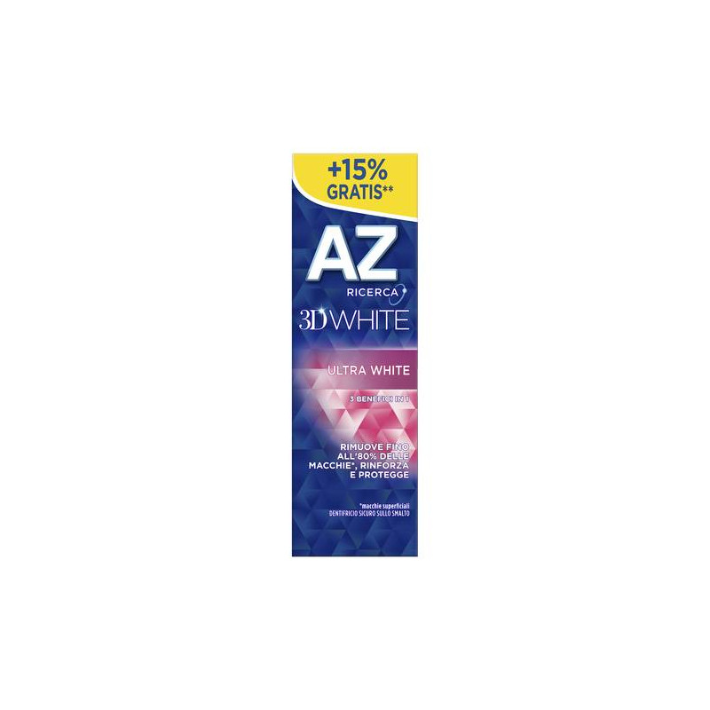 Descrizione Il dentifricio AZ 3D White Ultra White è clinicamente testato, rimuove fino all’87% delle macchie superficiali e inizia a sbiancare già dopo il primo utilizzo.