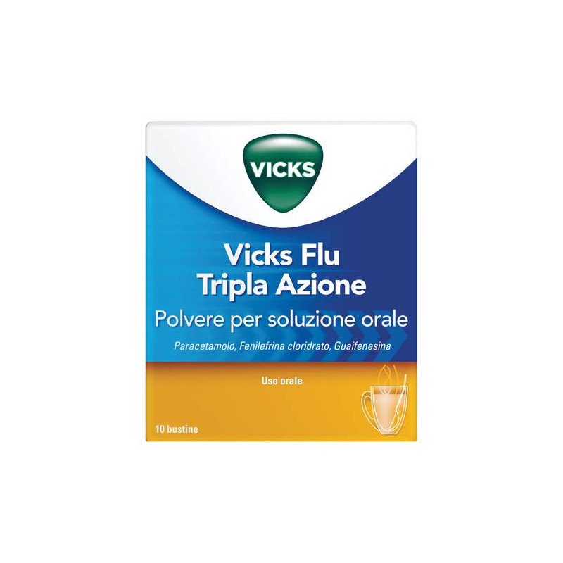 AVVERTENZE Non e' raccomandato l'uso prolungato del prodotto. Si deve raccomandare ai pazienti di non assumere altri prodotti contenenti paracetamolo o contenenti gli stessi principi attivi del presente preparato. Si deve inoltre raccomandare ai pazienti di evitare l'assunzione contemporanea di alcol, altri prodotti decongestionanti o prodotti contro tosse o raffreddore. Occore verificare che i preparati contenenti simpaticomimetici non vengano somministrati contemporaneamente attraverso piu' vie, ovvero per via orale e topica (preparati nasali, auricolari e oculari). Il presente medicinale deve essere raccomandato solo in presenza di tutti i sintomi (dolore e/o febbre, congestione nasale e tosse bronchiale). I rischi legati al sovradosaggio sono maggiori nei pazienti con epatopatia alcolica non cirrotica. Usare con cautela nei pazienti che stanno assumendo digitale, bloccanti beta-adrenergici, metildopa o altri agenti antipertensivi. Usare con cautela nei pazienti affetti da ipertrofia prostatica in quanto potenzialmente soggetti a ritenzione urinaria. I prodotti contenenti simpaticomimetici devono essere usati con molta cura nei pazienti che stanno assumendo fenotiazine. Uso nei pazienti con fenomeno di Raynaud. Consultare il medico prima dell'uso in caso di tosse persistente o cronica come quella che si manifesta con fumo, asma, bronchite cronica o enfisema. Contiene saccarosio. I pazienti affetti da rari problemi ereditari di intolleranza al fruttosio, da malassorbimento del glucosio-galattosio o da insufficienza di sucrasiisomaltasi non devono assumere questo medicinale. Contiene 157 mg di sodio per dose. Da tenere in considerazione in persone con ridotta funzionalita' renale o che seguono una dieta a basso contenuto di sodio. Contiene aspartame (E951). Questo medicinale contiene una fonte di fenilalanina. Puo' esserle dannoso se e' affetto da fenilchetonuria. CATEGORIA FARMACOTERAPEUTICA Analgesici ed antipiretici. CONSERVAZIONE Non conservare al di sopra dei 25 gradi C. CONTROINDICAZIONI/EFF.SECONDAR Ipersensibilita' al paracetamolo, alla guaifenesina, alla fenilefrina cloridrato o ad uno qualsiasi degli eccipienti; compromissione epatica o compromissione renale grave; ipertensione; ipertiroidismo; diabete; malattie cardiache; glaucoma ad angolo chiuso; porfiria; utilizzo in pazienti che stanno assumendo antidepressivi triciclici; utilizzo in pazienti che stanno assumendo, o che hanno assunto nelle 2 settimane precedenti, inibitori della monoamina ossidasi (IMAO); utilizzo in pazienti che stanno assumendo farmaci betabloccanti; utilizzo in pazienti che stanno assumendo altri farmaci simpaticomimetici Bambini al di sotto dei 12 anni. DENOMINAZIONE VICKS FLU TRIPLA AZIONE POLVERE PER SOLUZIONE ORALE ECCIPIENTI Saccarosio; acido citrico; acido tartarico; ciclamato di sodio; citrato di sodio; aspartame (E951); acesulfame potassio (E950); mentolo in polvere; aroma limone; aroma succo di limone; giallo di chinolina (E104). EFFETTI INDESIDERATI L'incidenza di effetti indesiderati e' di solito classificata come di seguito: molto comune (>10); comune (>1/100 a <1/10); non comune (>1/1000 a <1/100); raro (>1/10.000 a < 1/1000); molto raro (<1/10.000); non noto. Patologie cardiache: la fenilefrina puo' essere raramente associata a tachicardia (da >=1/10.000 a <=1 su 1000). Patologie del sistema emolinfopoietico: molto raramente (<1 su 10.000) sono state riportate discrasie ematiche come trombocitopenia, agranulocitosi, anemia emolitica, neutropenia, leucopenia e pancitopenia in seguito all'assunzione di paracetamolo, anche se puo' non esservi una relazione causale. Patologie del sistema nervoso: come con altre ammine simpaticomimetiche, raramente (da >=1/10.000 a <=1 su 1000) si possono manifestare insonnia, nervosismo, tremore, ansia, irrequietezza, confusione, irritabilita' e cefalea. E' inoltre noto che la guaifenesina puo' causare raramente (da >=1/10.000 a <=1 su 1000) cefalea e vertigini. Patologie gastrointestinali: anoressia, nausea e vomito sono comuni con i simpaticomimetici (da >=1 su 100 a <=1 su 10) e si possono manifestare con la fenilefrina. Disturbi gastrointestinali, nausea, vomito e diarrea sono gli effetti indesiderati piu' comuni associati alla guaifenesina, ma si verificano raramente (da >=1/10.000 a <=1 su 1000). Gli effetti gastrointestinali del paracetamolo sono molto rari ma sono stati riportati casi di pancreatite acuta in seguito all'ingestione di dosi superiori a quelle normali. Patologie renali e urinarie: nefrite interstiziale e' stata riportata casualmente dopo un uso prolungato di alte dosi di paracetamolo. Patologie della cute e del tessuto sottocutaneo: in seguito all'assunzione di paracetamolo possono manifestarsi raramente ipersensibilita', compreso rash cutaneo, e orticaria (da >=1/10.000 a <=1 su 1000). Patologie vascolari: in seguito all'assunzione di fenilefrina si possono manifestare raramente aumento della pressione sanguigna associato a cefalea, vomito e palpitazioni (da >=1/10.000 a <=1 su 1000). Disturbi del sistema immunitario: sono stati riportati rari casi (da >=1/10.000 a <=1 su 1000) di reazioni allergiche o di ipersensibilita' in seguito all'assunzione sia di fenilefrina che di paracetamolo, tra cui rash cutanei, orticaria, anafilassi e broncospasmo. Patologie epatobiliari: raramente (>= 1/10.000 a <= 1/1000), anomalie nei test della funzione epatica (aumento delle transaminasi epatiche). GRAVIDANZA E ALLATTAMENTO Studi epidemiologici sulle donne in gravidanza hanno dimostrato l'assenza di effetti negativi dovuti all'impiego di paracetamolo nei dosaggi raccomandati; tuttavia, le pazienti in stato di gravidanza sono tenute a seguire le indicazioni del proprio medico in merito all'uso del farmaco. Il paracetamolo e' escreto nel latte materno, anche se non in quantita' clinicamente significative. I dati pubblicati disponibili non riportano controindicazioni in merito all'allattamento. I dati sull'uso di fenilefrina in gravidanza sono limitati. 