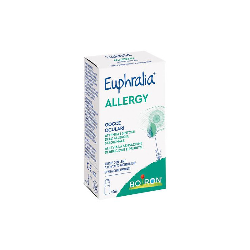 Dispositivo medico ad uso oftalmico costituito da una soluzione sterile, priva di conservanti, a media viscosità, a pH fisiologico ed isoosmotica, specificatamente basata su due gruppi di componenti: acido rosmarinico, vitamina B12, ed allantoina che svolgono un’azione antiossidante, anti-irritativa e lenitiva delle infiammazioni e, agendo in associazione, esplicano un effetto protettivo della superficie oculare; acido ialuronico, idrossipropilmetilcellulosa e glicerina, rispettivamente lubrificante, idratante e viscosizzante, umettante. Grazie alla particolare composizione quali-quantitativa, Euphralia ALLERGY espleta un’azione anti-irritativa, antiossidante, idratante e lubrificante e quindi lenitiva. Protegge la superficie oculare coadiuvando i meccanismi antiossidativi fisiologici ed integra ed aumenta la componente acquosa del film lacrimale, con l’effetto finale di favorire il mantenimento o il ripristino del trofismo dei tessuti oculari. È quindi particolarmente indicata sia in situazioni di allergie oculari sia in caso di altri discomfort oculari provocati da stress ambientale o meccanico. È inoltre indicata per schermare e proteggere da radiazioni UV e LUCE BLU. La combinazione acido ialuronico e idrossipropilmetilcellulosa rende la formulazione mediamente viscosa, con lo scopo di contrastare l’allontanamento naturale delle gocce oculari dalla superficie dell’occhio, durante l’ammiccamento, senza tuttavia causare offuscamento della visione o discomfort tipici dei prodotti ad elevata viscosità.