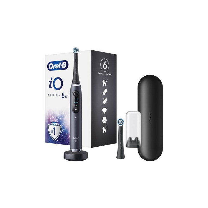 Spazzolino elettrico che combina la testina rotonda dello spazzolino Oral-B con micro-vibrazioni per uno spazzolamento delicato; è dotato di display interattivo a colori e di sensore di pressione iO che indica con una spia di colore rossa, bianca o verde òa coretta pressione di spazzolamento. Sfrutta 6 odalità smart e una tecnologia con