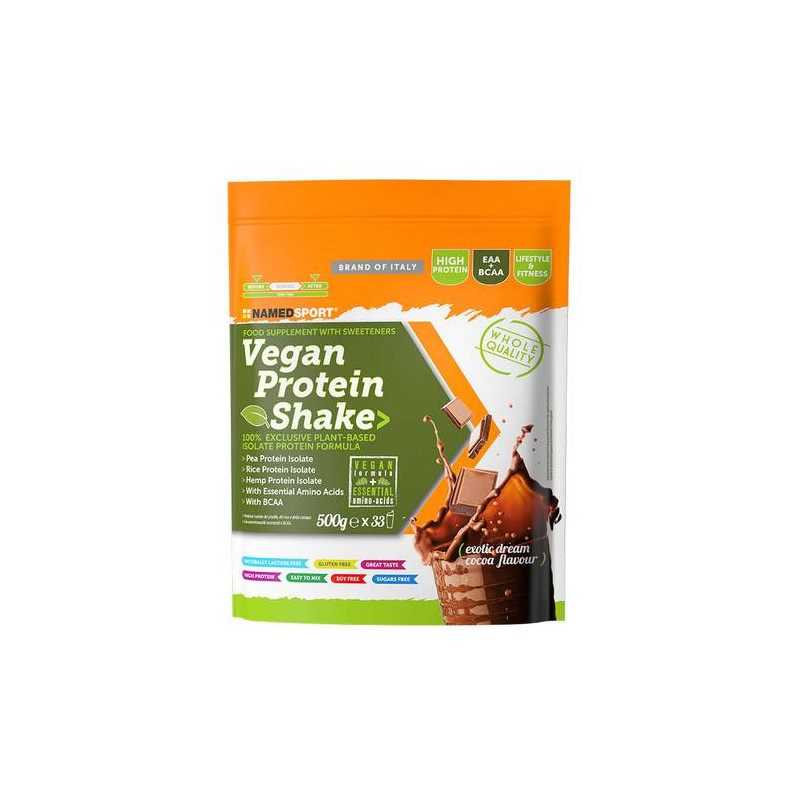 Miscela di proteine isolate di origine vegetale (78,9%) [proteina di pisello (68%), proteina di riso (7,9%), proteina di canapa (3%)], miscela di aminoacidi essenziali (lisina, treonina, triptofano, metionina, fenilalanina), miscela di aminoacidi essenziali ramificati in rapporto 2:1:1 (leucina, isoleucina, valina), cacao in polvere, aromi, edulcoranti: acesulfame K, sucralosio.
