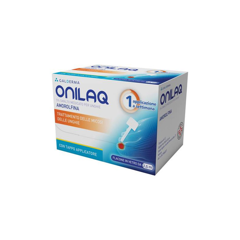 AVVERTENZE Avvertenze speciali: Onilaq non deve essere applicato sulla cute intorno all'unghia. Evitare ogni contatto di ONILAQ con occhi, orecchie o mucose. A causa della mancanza di esperienza clinica ad oggi, i bambininon devono essere trattati con Onilaq. La cura deve essere stabilitadal medico nel caso di pazienti affetti da malattie vascolari periferiche, diabete, malattie del sistema immunitario, come pure in pazienticon distrofia ungueale o unghie gravemente danneggiate (con lesioni superiori a due terzi della lamina ungueale). In questi casi, deve essere prevista una terapia sistemica. Pazienti con storia pregressa di lesioni, condizioni cutanee quali psoriasi o altra condizione cronica della cute, edema, disturbi respiratori (Sindrome delle unghie gialle), unghie doloranti, unghie distorte/deformate o altri sintomi devono rivolgersi al medico prima di iniziare il trattamento. Durante il trattamento con amorolfina non devono essere utilizzati smalti cosmetici o unghie artificiali. In caso di utilizzo di solventi organici, e' bene indossare guanti impermeabili per non rimuovere lo strato di amorolfina smalto medicato per unghie. Dopo l'uso di questo prodotto potrebbe verificarsi una reazione allergica sistemica o locale. In questo caso, interrompere immediatamente l'applicazione del prodotto e consultare un medico. Rimuovere accuratamente il prodotto utilizzando un solvente perunghie. Il prodotto non deve essere riapplicato. Questo medicinale contiene etanolo, puo' causare sensazione di bruciore sulla pelle danneggiata. Questo medicinale contiene etanolo, che e' una sostanza infiammabile, pertanto non deve essere usato vicino a fiamme libere, sigarette accese o alcuni dispositivi (ad esempio asciugacapelli). Precauzionidi impiego: In assenza di dati clinici, l'uso di ONILAQ non e' raccomandato in pazienti al di sotto dei 18 anni. CATEGORIA FARMACOTERAPEUTICA Altri antimicotici per uso topico. CONSERVAZIONE Tenere il flacone lontano da fonti di calore. Chiudere il flacone avvitando a fondo dopo l'uso. CONTROINDICAZIONI/EFF.SECONDAR Ipersensibilita' al principio attivo o ad uno qualsiasi degli eccipienti elencati al paragrafo 6.1. DENOMINAZIONE ONILAQ 5% SMALTO MEDICATO PER UNGHIE. ECCIPIENTI Copolimero dell'acido metacrilico tipo A (EUDRAGIT RL100), triacetina,butile acetato, etile acetato, alcool etilico assoluto. EFFETTI INDESIDERATI Disordini del sistema immunitario. Non nota*: ipersensibilità (reazione allergica sistemica). Patologie della cute e del tessuto sottocutaneo. Raro (>= 1/10.000, < 1/1.000): disturbi ungueali, decolorazione dell'unghia, onicoclasia (rottura ungueale), onicoressi (fragilità ungueale); molto raro (< 1/10.000): sensazione di bruciore cutaneo; non nota*: eritema*, prurito*, dermatite da contatto*, orticaria*, vesciche*.*Esperienze post-marketing. Segnalazione delle reazioni avverse sospette: la segnalazione delle reazioni avverse sospette che si verificanodopo l'autorizzazione del medicinale e' importante, in quanto permetteun monitoraggio continuo del rapporto beneficio/rischio del medicinale. Agli operatori sanitari e' richiesto di segnalare qualsiasi reazione avversa sospetta tramite il sistema nazionale di segnalazione all'indirizzo: http://www.aifa.gov.it/content/segnalazioni-reazioni-avverse GRAVIDANZA E ALLATTAMENTO L'esperienza clinica relativa all'utilizzo di amorolfina durante la gravidanza e/o l'allattamento e' limitata. Sono stati riportati solo pochi casi di esposizione all'uso topico di amorolfina in donne in gravidanza durante il periodo post-autorizzativo, pertanto il rischio potenziale non e' noto. Studi condotti in animali hanno mostrato una tossicita' riproduttiva a dosi orali elevate (vedere paragrafo 5.3); non e' noto se l'amorolfina e' escreta nel latte materno. L'amorolfina non deve essere usata durante la gravidanza e/o l'allattamento a meno che nonsia chiaramente necessario. INDICAZIONI Trattamento delle onicomicosi subungueali distali e laterali, di lieveentita' causate da dermatofiti, lieviti e muffe che coinvolgono non piu' di due unghie del soggetto adulto. INTERAZIONI I dati attualmente disponibili non evidenziano l'esistenza di interazioni clinicamente rilevanti. POSOLOGIA Posologia. Applicare ONILAQ sulle unghie affette una volta alla settimana. Modo di somministrazione. Effettuare l'applicazione dello smaltoosservando attentamente le seguenti raccomandazioni: prima di iniziareil primo trattamento con ONILAQ, pulire accuratamente le unghie. Eliminare eventuali strati di smalto precedentemente applicato con un solvente per unghie; poi, con una limetta per unghie, limare la superficiedell'unghia (in particolare la superficie dell'unghia affetta) il piu' accuratamente possibile. Prestare attenzione a non limare l'area cutanea peri-ungueale. La superficie dell'unghia deve essere pulita e sgrassata utilizzando uno dei tamponi detergenti (in dotazione). Con unodegli applicatori in dotazione (riutilizzabili) applicare lo smalto sututta la superficie dell'unghia. Tra un'applicazione sull'unghia e l'altra pulire l'applicatore con il tampone detergente in dotazione, inmodo da evitare di contaminare lo smalto medicato per unghie. Non strofinare l'applicatore sul bordo del flacone stesso. Per evitare di contaminare lo smalto, l'applicatore deve essere accuratamente pulito conuno dei tamponi detergente forniti, dopo ogni applicazione, prima di procedere con il trattamento di un'altra unghia. Se lo smalto viene a contatto con la parte esterna del tappo, pulire con un tampone detergente in dotazione per evitare il contatto con la cute. Tenere il flaconeben chiuso. Ripetere il procedimento per ognuna delle unghie affette.Dopo ogni applicazione di ONILAQ, e' importante lavare le mani. Se l'applicazione avviene sulle unghie delle mani, attendere che lo smaltosia completamento asciutto prima di procedere al lavaggio. Il trattamento deve essere continuato senza interruzioni fino a quando l'unghia si e' rigenerata e le aree colpite sono fin