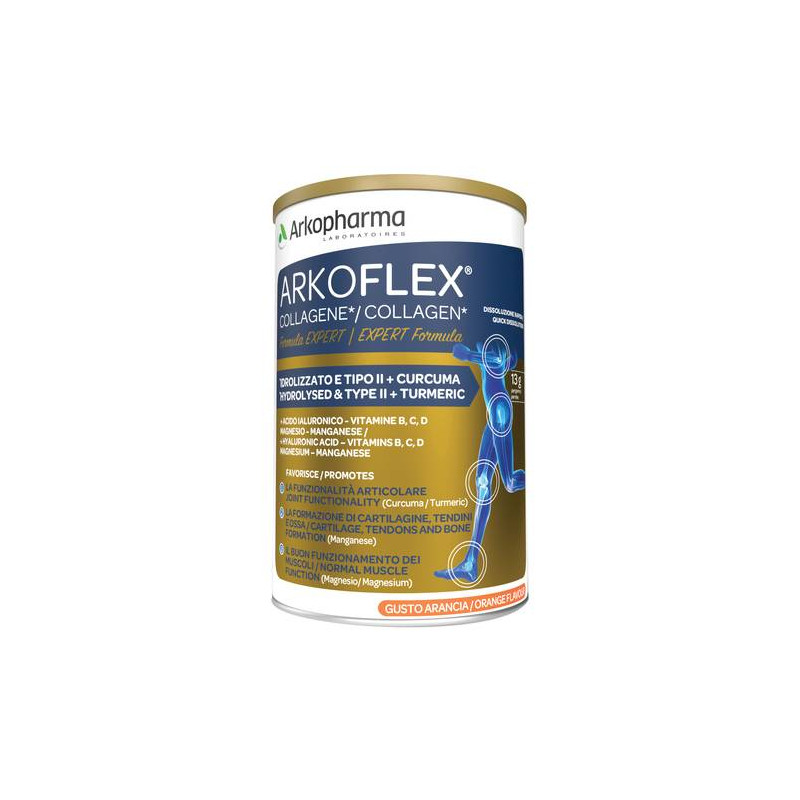 Integratore alimentare in polvere a base di collagene idrolizzato tipo II nativo, acido ialuronico, magnesio, manganese, curcuma e vitamine C, B1, B2, B6, B12 e D. Con edulcoranti.