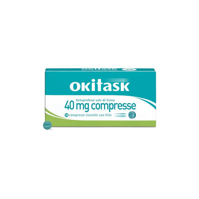 Posologia. Adulti e maggiori di 15 anni: la dose raccomandata e' 1 compressa in dose singola, o ripetuta 2-3 volte al giorno nelle forme dolorose di maggiore intensita'. Non superare le dosi raccomandate. Popolazioni particolari. Anziani. La posologia deve essere attentamente stabilita prendendo in considerazione un'eventuale riduzione dei dosaggisopraindicati. Pazienti con insufficienza epatica o renale. Si raccomanda una terapia al dosaggio minimo giornaliero e un attento monitoraggio (vedere paragrafo 4.4). In caso di insufficienza renale si raccomanda di controllare il volume di diuresi e la funzionalita' renale (vedere paragrafo 4.4). Okitask 40 mg compresse non deve essere utilizzatoin pazienti con severe disfunzioni epatiche e renali (vedere paragrafo4.3). Popolazione pediatrica. La sicurezza e l'efficacia di Okitask 40 mg compresse nei bambini non sono state ancora stabilite. Modo di somministrazione: e' preferibile assumere il prodotto a stomaco pieno. Durata di trattamento: La durata della terapia dovra' essere limitata al superamento dell'episodio doloroso. La dose efficace piu' bassa deveessere usata per il periodo piu' breve necessario ad alleviare i sintomi (vedere paragrafo 4.4).