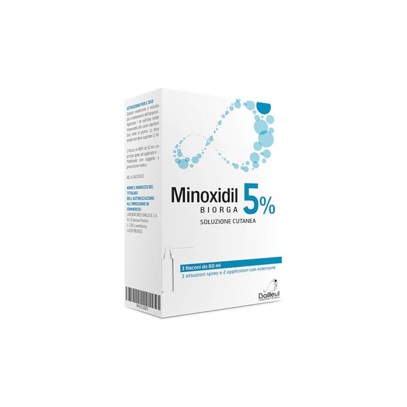 AVVERTENZE I pazienti con patologia cardiovascolare o aritmia cardiaca nota devono consultare un medico prima di utilizzare Minoxidil Biorga 5%, soluzione cutanea. Minoxidil Biorga 5%, soluzione cutanea non e' indicata inassenza di familiarita' per perdita di capelli, perdita di capelli improvvisa e/o a chiazze, perdita di capelli dovuta al parto o quando lacausa della perdita dei capelli non e' nota. Minoxidil Biorga 5%, soluzione cutanea deve essere applicata soltanto su un cuoio capelluto normale e sano. Non utilizzare se il cuoio capelluto e' rosso, infiammato, infetto, irritato o dolente o se si utilizzano altri medicinali sulcuoio capelluto. Alcuni eccipienti di Minoxidil Biorga 5%, soluzionecutanea possono causare bruciore e irritazione. In caso di contatto accidentale con superfici sensibili (occhi, pelle abrasa e membrane mucose), la zona deve essere lavata con abbondante quantita' di acqua di rubinetto fresca. Si deve evitare di inalare lo spray. Non ingerire. Ilpaziente deve smettere di usare Minoxidil Biorga 5%, soluzione cutanea e consultare il medico se rileva ipotensione o manifesta un dolore toracico, un'accelerazione del battito cardiaco, svenimento o capogiro,aumento ponderale improvviso, rigonfiamento delle mani o dei piedi earrossamento o irritazione persistenti del cuoio capelluto. Alcuni pazienti hanno manifestato alterazioni del colore e/o della consistenza dei capelli con l'uso di Minoxidil Biorga 5%, soluzione cutanea. Popolazione pediatrica: l'ingestione accidentale puo' causare eventi avversicardiaci gravi. Pertanto, Minoxidil Biorga 5%, soluzione cutanea deveessere tenuta fuori dalla portata dei bambini. CATEGORIA FARMACOTERAPEUTICA Agenti dermatologici. CONSERVAZIONE Prodotto infiammabile. Proteggere dal calore. Tenere il contenitore ben chiuso. CONTROINDICAZIONI/EFF.SECONDAR Ipersensibilita' al principio attivo o ad uno qualsiasi degli eccipienti elencati al paragrafo 6.1. Minoxidil Biorga 5%, soluzione cutanea non e' indicata nei casi di perdita dei capelli improvvisa o inspiegabile. Inoltre, Minoxidil Biorga 5%, soluzione cutanea non deve essere utilizzata se la perdita dei capelli e' associata a gravidanza, parto opatologie gravi, come malfunzionamento della tiroide, lupus, perdita di sezioni di capelli associata a infiammazione del cuoio capelluto o altre patologie. DENOMINAZIONE MINOXIDIL BIORGA 5% SOLUZIONE CUTANEA ECCIPIENTI Glicole propilenico, etanolo 96%, acqua depurata. EFFETTI INDESIDERATI La frequenza delle reazioni avverse alla soluzione di minoxidil per uso topico e' definita in base alla seguente convenzione: molto comune (>= 1/10), comune (>= 1/100, < 1/10), non comune (>= 1/1.000, < 1/100),raro (>= 1/10.000, <1/1.000), molto raro (< 1/10.000), non nota (la frequenza non puo' essere definita sulla base dei dati disponibili). Iseguenti eventi avversi sono stati associati all'uso di soluzioni a base di minoxidil (associati al 2% e 5%) in soggetti di ambo i sessi, con un'incidenza maggiore dell'1% e superiore rispetto agli studi clinici controllati con placebo. Disturbi psichiatrici. Comune: depressione.Patologie del sistema nervoso. Molto comune: cefalea. Patologie respiratorie, toraciche e mediastiniche. Comune: dispnea. Patologie della cute e del tessuto sottocutaneo. Comune: prurito, ipertricosi, eruzionecutanea, eruzione cutanea acneiforme, dermatite, disturbo cutaneo infiammatorio. Patologie del sistema muscoloscheletrico e del tessuto connettivo. Comune: dolore muscoloscheletrico. Patologie sistemiche e condizioni relative alla sede di somministrazione. Comune: edema periferico. Varie. Comune: dolore. I seguenti eventi avversi sono stati associati all'uso di soluzioni topiche a base di minoxidil durante il periodo post-commercializzazione. Disturbi del sistema immunitario. Frequenza non nota: reazioni allergiche, incluso l'angioedema. Patologie del sistema nervoso. Raro: cefalea. Patologie cardiovascolari. Raro palpitazioni, aumento della frequenza cardiaca, dolore toracico; molto raro:ipotensione. Patologie della cute e del tessuto sottocutaneo. Non comune: secchezza cutanea, esfoliazione cutanea, eruzione cutanea, perditatemporanea di capelli, ipertricosi, alterazioni della consistenza delcapello, alterazioni del colore del capello; raro: dermatite da contatto. Patologie sistemiche e condizioni relative alla sede di somministrazione. Non comune: prurito alla sede di applicazione, irritazione alla sede di applicazione; raro: eritema alla sede di applicazione. Segnalazione delle reazioni avverse sospette. La segnalazione delle reazioni avverse sospette che si verificano dopo l'autorizzazione del medicinale e' importante, in quanto permette un monitoraggio continuo del rapporto beneficio/rischio del medicinale. Agli operatori sanitari e' richiesto di segnalare qualsiasi reazione avversa sospetta tramite il sistema nazionale di segnalazione all'indirizzo https://www.aifa.gov.it/content/segnalazioni-reazioni-avverse. GRAVIDANZA E ALLATTAMENTO Gravidanza: non sono stati effettuati finora studi adeguati e ben controllati nelle donne in gravidanza. Gli studi condotti sugli animali hanno fatto emergere un rischio per il feto a livelli di esposizione chesono molto elevati rispetto a quelli destinati all'esposizione nell'uomo. Nell'uomo e' possibile, sebbene remoto, un basso rischio di dannofetale (vedere paragrafo 5.3 Dati preclinici di sicurezza). Allattamento: il minoxidil assorbito per via sistemica e' escreto nel latte materno. Il minoxidil per via topica deve essere utilizzato durante la gravidanza o l'allattamento soltanto se il beneficio per la madre superiil potenziale rischio per il feto o il lattante. INDICAZIONI Minoxidil Biorga 5%, soluzione cutanea e' indicata per il trattamentodell'alopecia. INTERAZIONI Gli studi di interazione farmacocinetica condotti nell'uomo hanno rivelato che l'assorbimento percutaneo del minoxidil e' aumentato da tretinoina e antralina in conseguenza della maggiore permeabilita' dello strato corneo; il betame