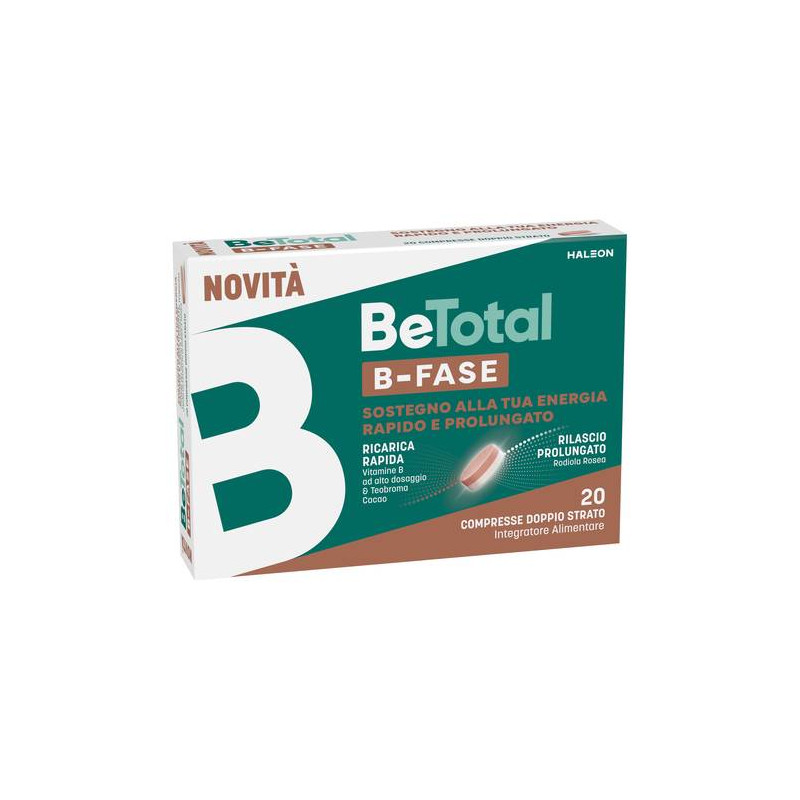 Grazie alla sua tecnologia, ogni compressa doppio strato di BeTotal B-Fase rilascia i nutrienti in due fasi nel tempo: rapidamente una ricarica di vitamine B ad alto dosaggio, che agiscono in sinergia con il corpo per contribuire al normale metabolismo energetico (vitamina B1, B2, B3, B5, B6, B12, biotina) combinate a estratto di teobroma cacao, ad azione tonica e di sostegno al metabolismo; in modo prolungato, l’estratto di rodiola rosea, che ha proprietà toniche contro stanchezza fisica e mentale e proprietà adattogene di sostegno all’organismo in risposta a fattori stressanti esterni.