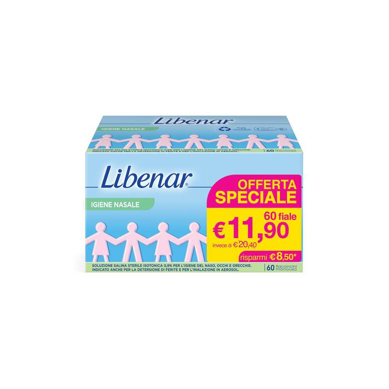 Soluzione salina sterile isotonica allo 0,9% in flaconcini monouso per l'igiene del naso, occhi e orecchie.