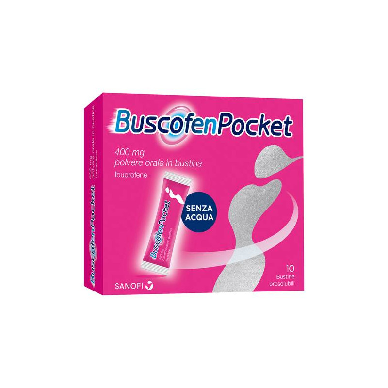 Posologia: solo per uso di breve durata. Gli effetti indesiderati possono essere limitati usando la dose minima efficace per la durata minima necessaria a controllare i sintomi (vedere paragrafo 4.4). Negli adulti questo medicinale non deve essere usato per piu' di 3 giorni in caso di febbre o per piu' di 4 giorni in caso di dolore. Consultare il medico se i sintomi persistono o peggiorano. Negli adolescenti di eta'superiore ai 12 anni, il medicinale non deve essere utilizzato per piu' di 3 giorni. Consultare il medico se i sintomi persistono o peggiorano. Adulti e adolescenti con peso corporeo pari o superiore a 40 kg (di eta' pari o superiore ai 12 anni): la dose iniziale e' di 1 bustinadi Buscofenpocket 400 mg. Se necessario e' possibile assumere una ulteriore bustina di Buscofenpocket 400 mg. L'intervallo tra le dosi deveessere scelto in linea con i sintomi osservati e la dose giornaliera massima raccomandata. Non deve essere inferiore a sei ore. Non superarela dose di 1200 mg (3 bustine di Buscofenpocket 400 mg) nelle 24 ore.Bambini di eta' inferiore ai 12 anni e adolescenti con peso corporeo< 40 kg: Buscofenpocket 400 mg non e' adatto a bambini di eta' inferiore ai 12 anni e adolescenti con peso corporeo < 40 kg. Anziani: nei pazienti anziani, il dosaggio e' lo stesso di quello per gli adulti, mae' necessario prestare maggiore cautela (vedere paragrafo 4.4). Compromissione della funzionalita' epatica o renale: Buscofenpocket 400 mg e' controindicato nei pazienti con grave insufficienza epatica o graveinsufficienza renale (vedere paragrafo 4.3). Nei pazienti con compromissione lieve-moderata della funzionalita' renale o epatica non e' necessaria una riduzione della dose, tuttavia e' necessario prestare maggiore cautela (vedere paragrafo 4.4). Modo di somministrazione: uso orale. Mettere la polvere orale sulla lingua, lasciarla dissolvere e poi inghiottirla; non e' necessaria acqua. Si consiglia l'assunzione durante i pasti, particolarmente alle persone con stomaco delicato.
