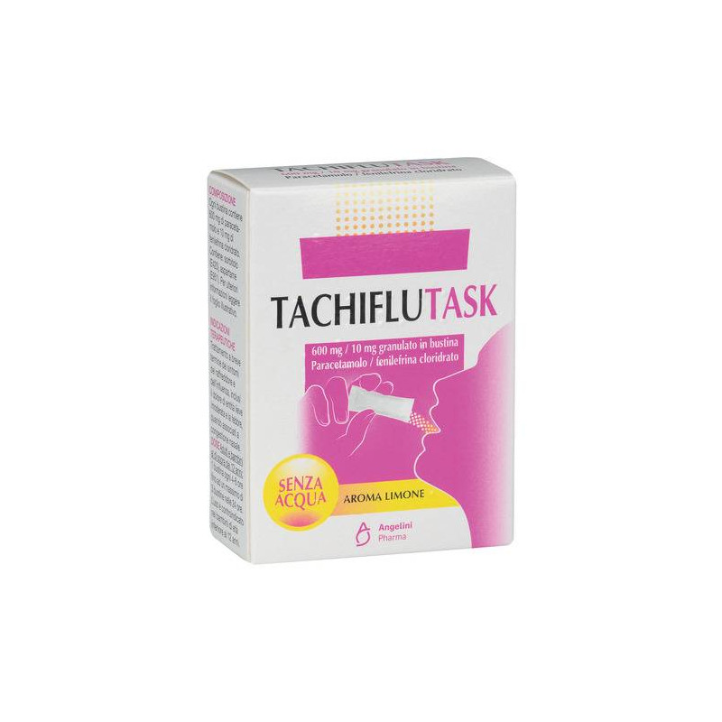 AVVERTENZE I pazienti devono essere avvisati di non prendere altri medicinali contenenti paracetamolo mentre assumono Tachiflutask in quanto dosi elevate di paracetamolo possono causare reazioni avverse gravi. Evitare ilconsumo di alcool durante il trattamento con Tachiflutask. Il pericolodi sovradosaggio e' infatti maggiore nei pazienti con problemi epatici. Invitare il paziente a contattare il medico prima di associare warfarin o qualsiasi altro farmaco (vedere anche il paragrafo 4.5). E' sconsigliato l'uso del prodotto se il paziente e in trattamento con antiinfiammatori. Si consiglia cautela se il paracetamolo viene somministrato in concomitanza con flucloxacillina a causa dell'aumentato rischiodi acidosi metabolica con gap anionico elevato (HAGMA), in particolarenei pazienti con grave compromissione renale, sepsi, malnutrizione ealtre fonti di carenza di glutatione (ad es. alcolismo cronico), cosi'come in quelli che utilizzano le dosi massime giornaliere di paracetamolo. Si raccomanda un attento monitoraggio, inclusa la misurazione della 5-oxoprolina urinaria. Consultare il medico prima di usare il prodotto in pazienti con ingrossamento della ghiandola prostatica o malattie vascolari occlusive (ad es. sindrome di Raynaud). Non superare la dose consigliata e non somministrare per oltre 3 giorni consecutivi. Tachiflutask contiene aspartame: tale sostanza puo' essere dannosa in soggetti affetti da fenilchetonuria. Tachiflutask contiene meno di 1 mmol (23 mg) di sodio per compressa, cioe' e' essenzialmente senza sodio. CATEGORIA FARMACOTERAPEUTICA Altri analgesici/paracetamolo, associazioni. CONSERVAZIONE Questo medicinale non richiede alcuna temperatura particolare di conservazione. Conservare nel contenitore originario per proteggere il medicinale dall'umidita' e dalla luce. CONTROINDICAZIONI/EFF.SECONDAR Bambini di eta' inferiore ai 12 anni; ipersensibilita' ai principi attivi o ad uno qualsiasi degli eccipienti (elencati al paragrafo 6.1); pazienti che assumono beta-bloccanti; pazienti che assumono antidepressivi triciclici e quelli che assumono o hanno assunto nelle ultime 2 settimane inibitori delle monoamminoossidasi; pazienti con asma bronchiale, feocromocitoma, glaucoma ad angolo chiuso, o che assumono contemporaneamente altri medicinali simpatico mimetici (come decongestionanti,soppressori dell'appetito e psicostimolanti simili alle amfetamine).Pazienti affetti da insufficienza epatica o renale, diabete, ipertiroidismo, ipertensione e malattie cardiovascolari. I prodotti a base di paracetamolo sono controindicati nei pazienti con manifesta insufficienza della glucosio-6-fosfato deidrogenasi ed in quelli affetti da graveanemia emolitica. Grave insufficienza epatocellulare. DENOMINAZIONE TACHIFLUTASK 600 MG/10 MG GRANULATO IN BUSTINA PARACETAMOLO/FENILEFRINA CLORIDRATO ECCIPIENTI Mannitolo (E 421), xylitab 200 (xilitolo, carbossimetilcellulosa), aroma limone, sorbitolo (E 420) acido ascorbico, acido citrico, silice colloidale idrata, aspartame (E 951) saccarina sodica. EFFETTI INDESIDERATI Di seguito sono riportati gli effetti indesiderati organizzati secondola classificazione per Sistemi ed Organi MedDRA. La frequenza e cosidefinita: molto comune (>=1/10), comune (da >=1/100 a <1/10), non comune (da >=1/1000 a <1/100), raro (da >=1/10.000 a <1/1000), molto raro(<1/10.000), non nota (la frequenza non puo' essere definita sulla base dei dati disponibili). Patologie del sistema emolinfopoietico. Rara:agranulocitosi1, leucopenia1, trombocitopenia1; non nota: anemia1. Disturbi del sistema immunitario. Rara: reazioni allergiche1,2, reazionida ipersensibilita'1,2, anafilassi1,2; non nota: shock anafilattico1,2. Disturbi del metabolismo e della nutrizione. Comune: anoressia2. Disturbi psichiatrici. Molto rara: insonnia2, nervosismo2, ansia2, irrequietezza2, confusione2, irritabilita'22. Patologie del sistema nervoso. Molto rara: tremore2, capogiro2, cefalea2. Patologie dell'occhio. Non nota: midriasi2, glaucoma acuto ad angolo chiuso2. Patologie cardiache. Rara: tachicardia2, palpitazioni2. Patologie vascolari. Non nota:ipertensione2. Patologie respiratorie, toraciche e mediastiniche. Rara: broncospasmo1,2; non nota: edema della laringe1. Patologie gastrointestinali. Comune: nausea2, vomito2; non nota: diarrea1, patologia gastrointestinale1. Patologie epatobiliari. Rara: funzione epatica anormale1; non nota: patologia epatica1, epatite1. Patologie della cute e deltessuto sottocutaneo. Rara: eruzione cutanea1,2, angioedema2; non nota: necrolisi tossica epidermica1, sindrome di steven johnson1, eritemamultiforme o polimorfo1. Patologie renali e urinarie. Molto rara: nefrite tubulointerstiziale (dopo uso prolungato del paracetamolo a dosielevate)1; non nota: insufficienza renale aggravata1, ematuria1, anuria1 ritenzione di urina. ^1 Effetti indesiderati associati al paracetamolo. ^2 Effetti indesiderati associati alla fenilefrina. Sono stati segnalati casi molto rari di reazioni cutanee gravi. Segnalazione dellereazioni avverse sospette. La segnalazione delle reazioni avverse sospette che si verificano dopo l'autorizzazione del medicinale e' importante, in quanto permette un monitoraggio continuo del rapporto beneficio/rischio del medicinale. Agli operatori sanitari e' richiesto di segnalare qualsiasi reazione avversa sospetta tramite il sistema nazionaledi segnalazione all'indirizzo https://www.aifa.gov.it/content/segnalazioni-reazioni-avverse. GRAVIDANZA E ALLATTAMENTO Gravidanza; paracetamolo: una grande quantita' di dati sulle donne ingravidanza non indicano ne' tossicita' malformativa, ne' fetale/neonatale. Studi epidemiologici sullo sviluppo neurologico nei bambini esposti al paracetamolo in utero mostrano risultati non conclusivi. Se clinicamente necessario, il paracetamolo puo' essere usato durante la gravidanza, tuttavia dovrebbe essere usato alla dose efficace piu' bassa per il piu' breve tempo possibile e con la piu' bassa frequenza possibile. La somministrazione del preparato 