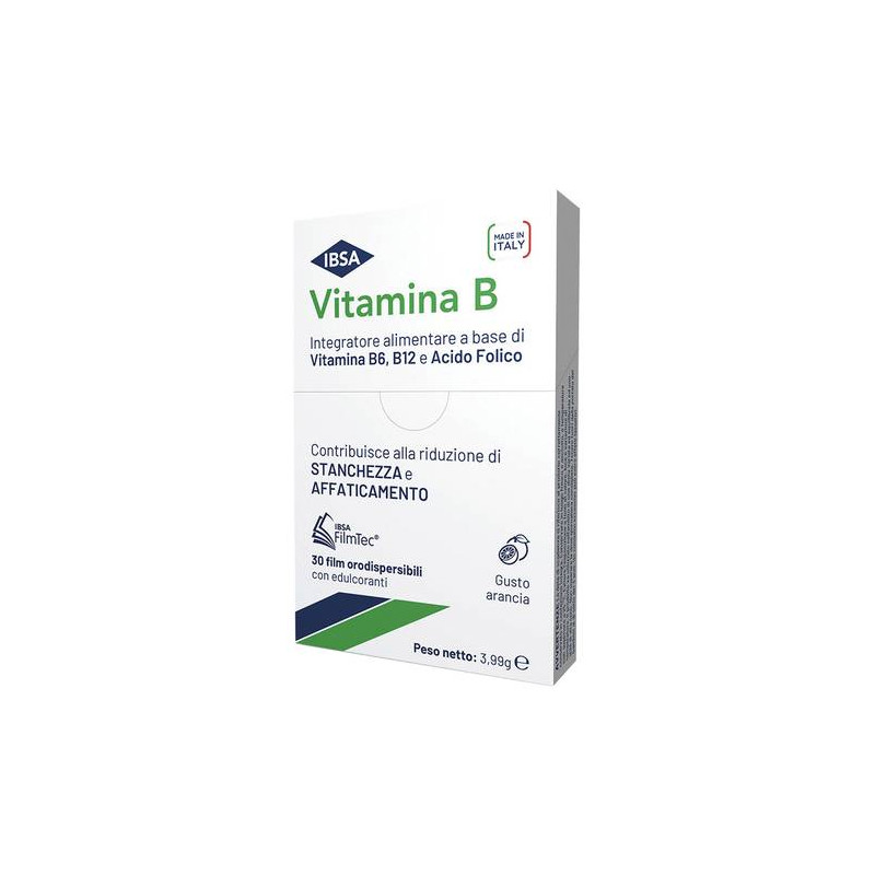 Vitamina B IBSA è disponibile sotto forma di film orodispersibili, una forma di assunzione dell’integratore molto semplice e pratica. Non deve essere assunto con acqua, si scioglie in pochi secondi una volta appoggiato sulla lingua. Può essere assunto in ogni momento e in ogni condizione, anche da parte di persone con difficoltà di deglutizione, allettate o in condizioni di particolare fragilità.