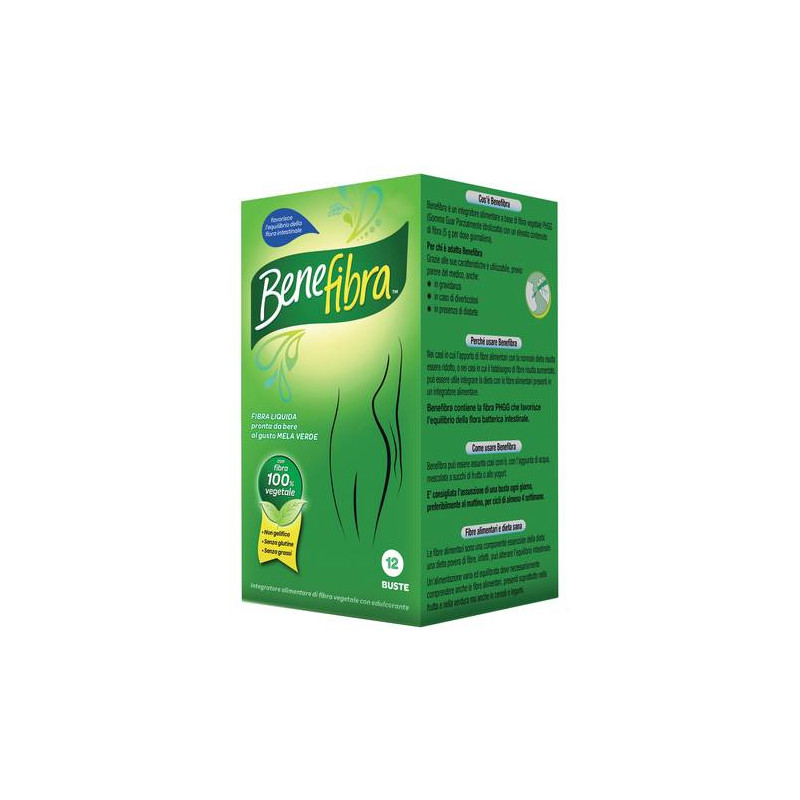 Benefibra è un integratore alimentare a base di fibra vegetale PHGG (gomma Guar parzialmente idrolizzata) con un elevato contenuto di fibra (5 g per dose giornaliera), che favorisce l'equilibrio della flora batterica intestinale.