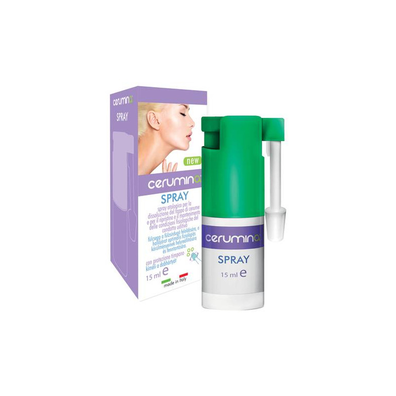 CERUMINA SPRAY Dispositivo medico CE, classe I, non sterile. Spray otologico per la dissoluzione/prevenzione del tappo di cerume per il ripristino e il mantenimento delle condizioni fisiologiche del condotto uditivo. È dotato di un dispositivo per la protezione del timpano posto all'estremità dell'applicatore.