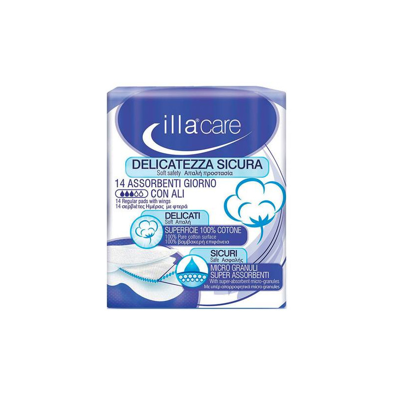 illacare giorno Assorbenti con superficie di contatto in cotone non sbiancato, trattato con estratti di aloe, camomilla e malva. Indicati per un flusso normale.